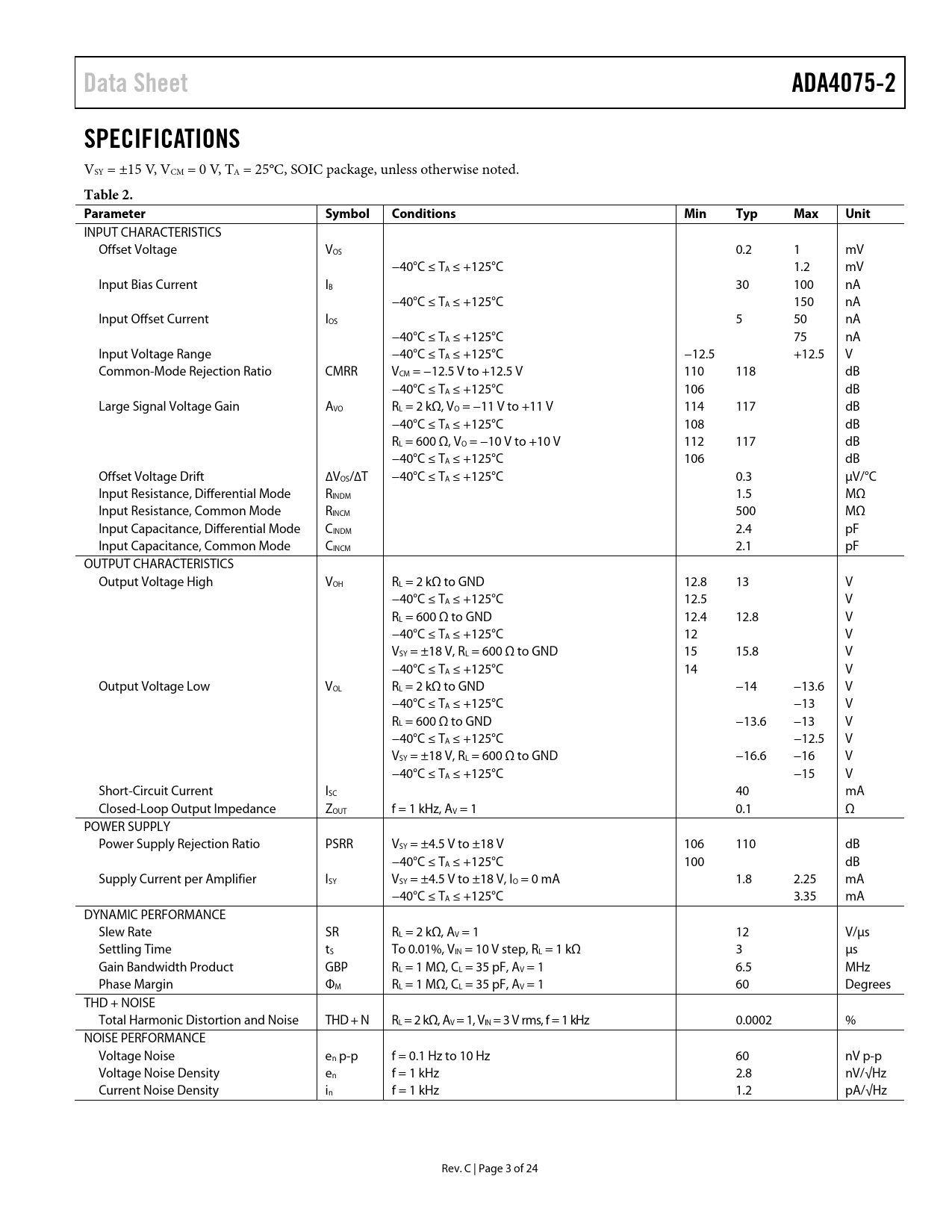Data SheetADA4075-2SPECIFICATIONS VSY = ±15 V, VCM = 0 V, TA = 25°C, SOIC package, unless otherwise noted. Table 2. ParameterSymbolConditionsMinTypMaxUnit INPUT CHARACTERISTICS Offset Voltage VOS 0.2 1 mV −40°C ≤ TA ≤ +125°C 1.2 mV Input Bias Current IB 30 100 nA −40°C ≤ TA ≤ +125°C 150 nA Input Offset Current IOS 5 50 nA −40°C ≤ TA ≤ +125°C 75 nA Input Voltage Range −40°C ≤ TA ≤ +125°C −12.5 +12.5 V Common-Mode Rejection Ratio CMRR VCM = −12.5 V to +12.5 V 110 118 dB −40°C ≤ TA ≤ +125°C 106 dB Large Signal Voltage Gain AVO RL = 2 kΩ, VO = −11 V to +11 V 114 117 dB −40°C ≤ TA ≤ +125°C 108 dB RL = 600 Ω, VO = −10 V to +10 V 112 117 dB −40°C ≤ TA ≤ +125°C 106 dB Offset Voltage Drift ∆VOS/∆T −40°C ≤ TA ≤ +125°C 0.3 µV/°C Input Resistance, Differential Mode RINDM 1.5 MΩ Input Resistance, Common Mode RINCM 500 MΩ Input Capacitance, Differential Mode CINDM 2.4 pF Input Capacitance, Common Mode CINCM 2.1 pF OUTPUT CHARACTERISTICS Output Voltage High VOH RL = 2 kΩ to GND 12.8 13 V −40°C ≤ TA ≤ +125°C 12.5 V RL = 600 Ω to GND 12.4 12.8 V −40°C ≤ TA ≤ +125°C 12 V VSY = ±18 V, RL = 600 Ω to GND 15 15.8 V −40°C ≤ TA ≤ +125°C 14 V Output Voltage Low VOL RL = 2 kΩ to GND −14 −13.6 V −40°C ≤ TA ≤ +125°C −13 V RL = 600 Ω to GND −13.6 −13 V −40°C ≤ TA ≤ +125°C −12.5 V VSY = ±18 V, RL = 600 Ω to GND −16.6 −16 V −40°C ≤ TA ≤ +125°C −15 V Short-Circuit Current ISC 40 mA Closed-Loop Output Impedance ZOUT f = 1 kHz, AV = 1 0.1 Ω POWER SUPPLY Power Supply Rejection Ratio PSRR VSY = ±4.5 V to ±18 V 106 110 dB −40°C ≤ TA ≤ +125°C 100 dB Supply Current per Amplifier ISY VSY = ±4.5 V to ±18 V, IO = 0 mA 1.8 2.25 mA −40°C ≤ TA ≤ +125°C 3.35 mA DYNAMIC PERFORMANCE Slew Rate SR RL = 2 kΩ, AV = 1 12 V/µs Settling Time tS To 0.01%, VIN = 10 V step, RL = 1 kΩ 3 µs Gain Bandwidth Product GBP RL = 1 MΩ, CL = 35 pF, AV = 1 6.5 MHz Phase Margin ΦM RL = 1 MΩ, CL = 35 pF, AV = 1 60 Degrees THD + NOISE Total Harmonic Distortion and Noise THD + N RL = 2 kΩ, AV = 1, VIN = 3 V rms, f = 1 kHz 0.0002 % NOISE PERFORMANCE Voltage Noise en p-p f = 0.1 Hz to 10 Hz 60 nV p-p Voltage Noise Density en f = 1 kHz 2.8 nV/√Hz Current Noise Density in f = 1 kHz 1.2 pA/√Hz Rev. C | Page 3 of 24 Document Outline Features Applications Pin Configurations General Description Table of Contents Revision History Specifications Absolute Maximum Ratings Thermal Resistance Power Sequencing ESD Caution Typical Performance Characteristics Applications Information Input Protection Total Harmonic Distortion Phase Reversal DAC Output Filter Balanced Line Driver Balanced Line Receiver Low Noise Parametric Equalizer Schematic Outline Dimensions Ordering Guide