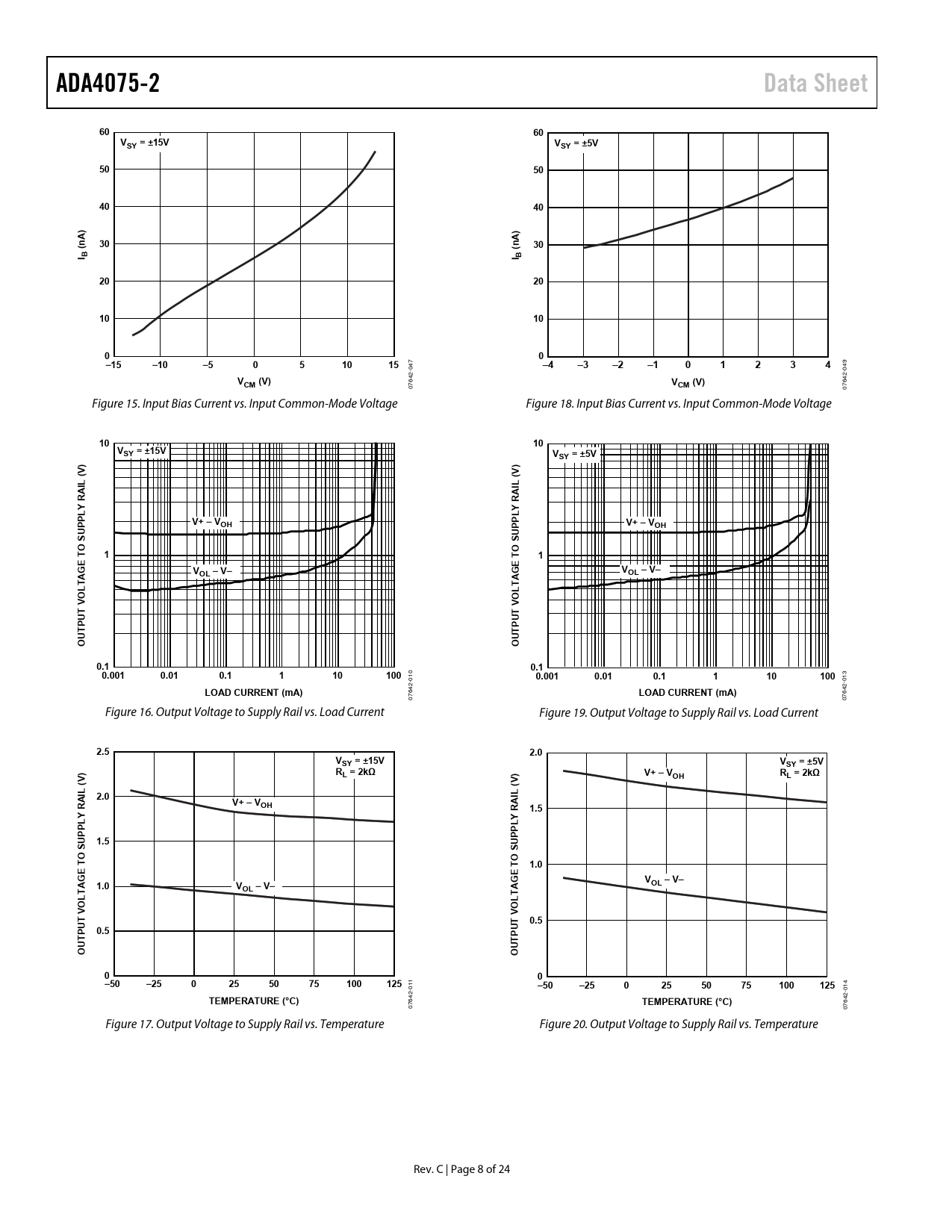 ADA4075-2. Data Sheet. VSY = ±15V. VSY = ±5V. I B. –15. –10. VCM (V). Y R. PPL. V+ – VOH. E T. OL – V–. O V. 0.1. 0.001. 0.01. 100. LOAD CURRENT (mA). 2.5. 2.0