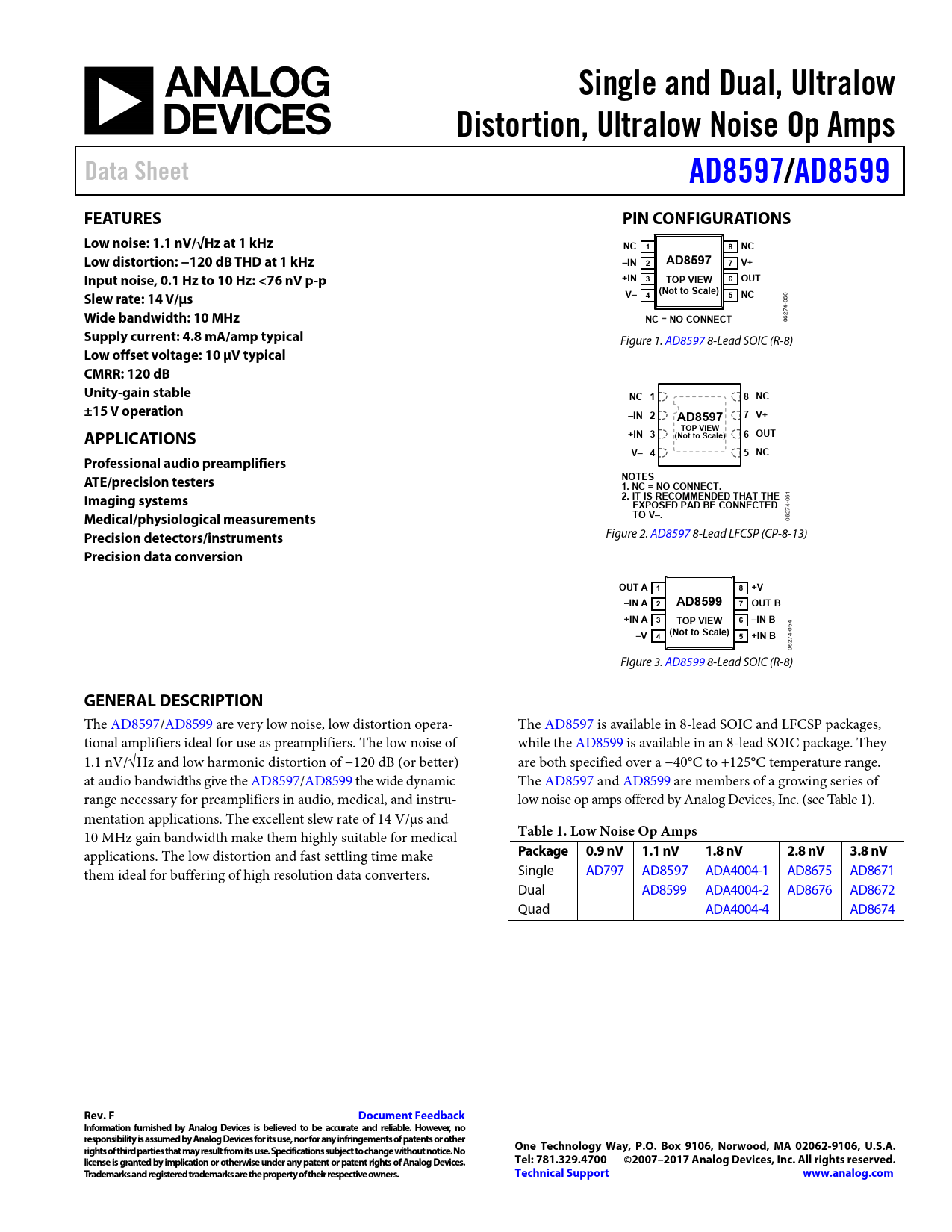 Single and Dual, Ultralow. Distortion, Ultralow Noise Op Amps. Data Sheet. AD8597/. AD8599. FEATURES. PIN CONFIGURATIONS
