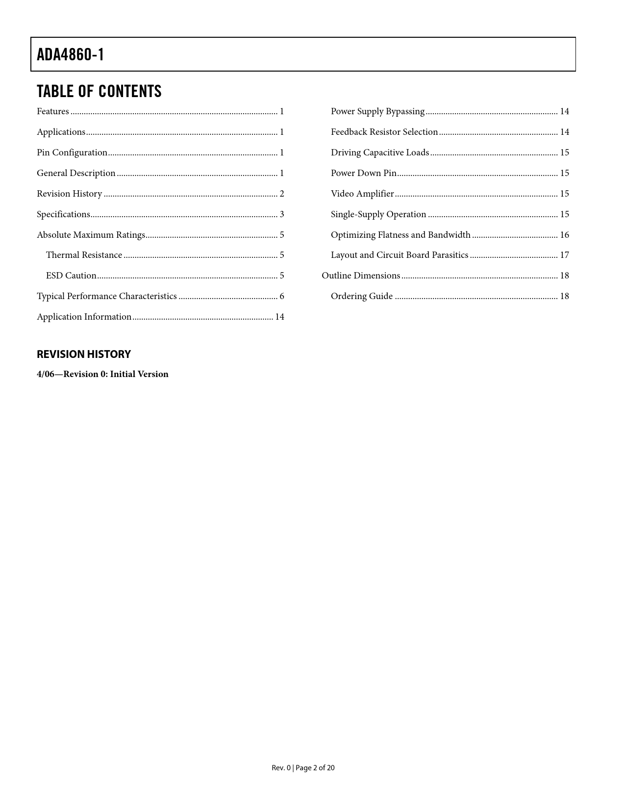 页数 / 页20 / 2 — ADA4860-1. TABLE OF CONTENTS. REVISION HISTORY. 4/06—Revision 0: Initial …