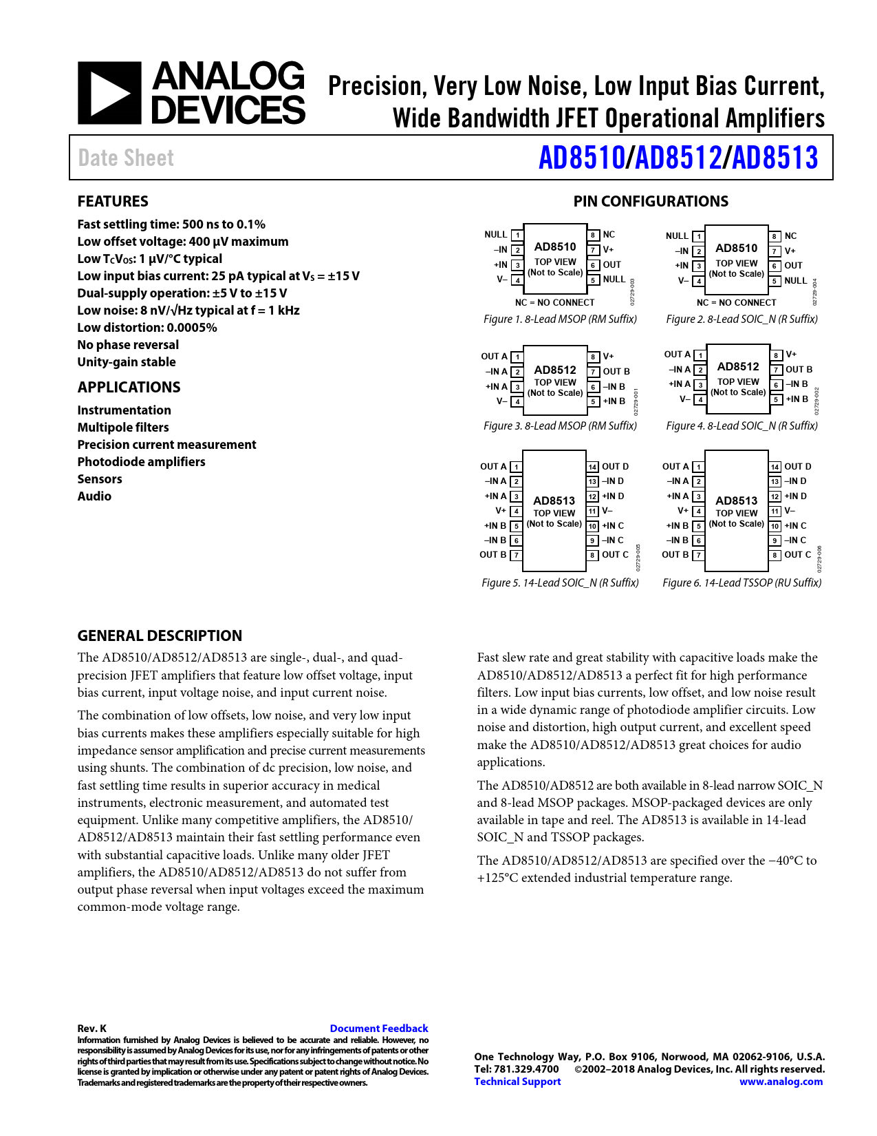 The AD8510/AD8512/AD8513 are single-, dual-, and quad- Fast slew rate and great stability with capacitive loads make the precision JFET amplifiers that feature low offset voltage, input AD8510/AD8512/AD8513 a perfect fit for high performance bias current, input voltage noise, and input current noise. filters. Low input bias currents, low offset, and low noise result The combination of low offsets, low noise, and very low input in a wide dynamic range of photodiode amplifier circuits. Low bias currents makes these amplifiers especially suitable for high noise and distortion, high output current, and excellent speed impedance sensor amplification and precise current measurements make the AD8510/AD8512/AD8513 great choices for audio using shunts. The combination of dc precision, low noise, and applications. fast settling time results in superior accuracy in medical The AD8510/AD8512 are both available in 8-lead narrow SOIC_N instruments, electronic measurement, and automated test and 8-lead MSOP packages. MSOP-packaged devices are only equipment. Unlike many competitive amplifiers, the AD8510/ available in tape and reel. The AD8513 is available in 14-lead AD8512/AD8513 maintain their fast settling performance even SOIC_N and TSSOP packages. with substantial capacitive loads. Unlike many older JFET The AD8510/AD8512/AD8513 are specified over the −40°C to amplifiers, the AD8510/AD8512/AD8513 do not suffer from +125°C extended industrial temperature range. output phase reversal when input voltages exceed the maximum common-mode voltage range.