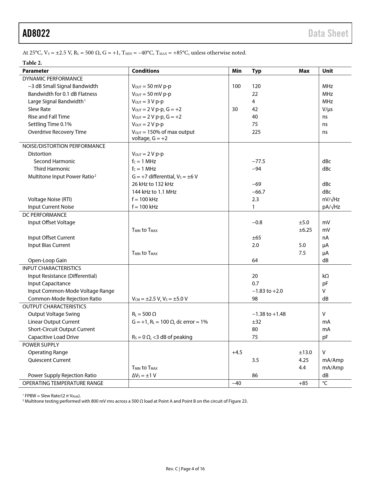 页数 / 页16 / 4 — AD8022. Data Sheet. Table 2. Parameter Conditions. Min. Typ. Max. Unit