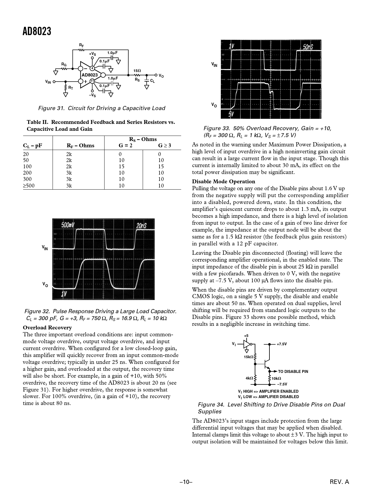AD8023 1.0 0.1 –VS Table II Recommended Feedback and Series Resistors vs Capacitive Load and Gain RS – Ohms L – pF RF – Ohms