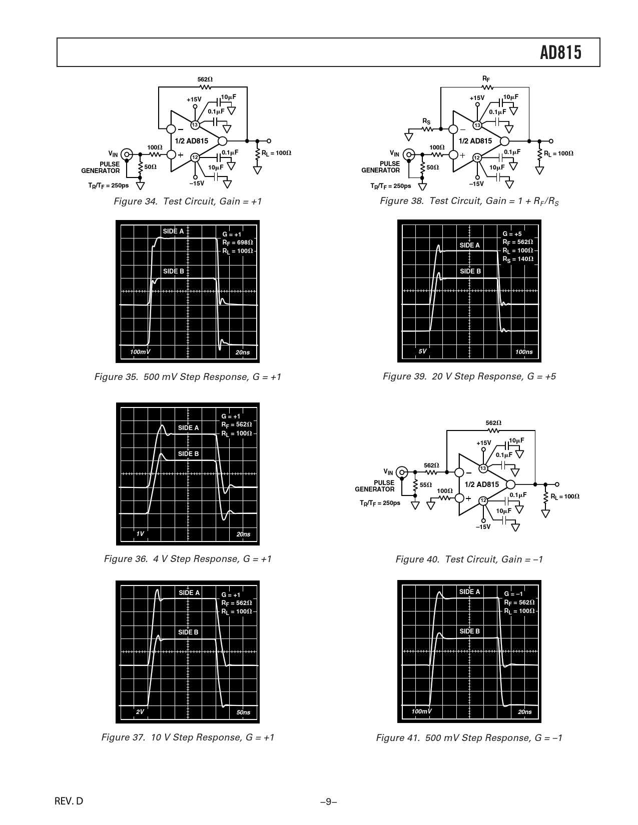 AD815. 562. +15V. 0.1. 1/2 AD815. 100. L = 100. PULSE. GENERATOR. –15V. R/TF = 250ps. TR/TF = 250ps. SIDE A. G = +1. G = +5. RF = 698. F = 562. RL = 100