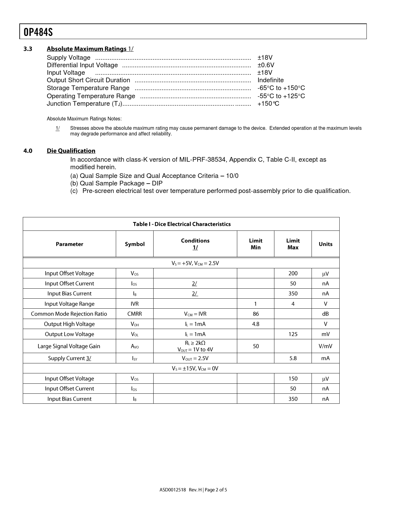 Supply Voltage ... ±18V Differential Input Voltage .. ±0.6V Input Voltage ... ±18V Output Short Circuit Duration ... Indefinite Storage Temperature Range ... -65C to +150C Operating Temperature Range .. -55C to +125C Junction Temperature (TJ).. ... +150°C Absolute Maximum Ratings Notes: 1/ Stresses above the absolute maximum rating may cause permanent damage to the device. Extended operation at the maximum levels may degrade performance and affect reliability. In accordance with class-K version of MIL-PRF-38534, Appendix C, Table C-II, except as modified herein. (a) Qual Sample Size and Qual Acceptance Criteria – 10/0 (b) Qual Sample Package – DIP (c) Pre-screen electrical test over temperature performed post-assembly prior to die qualification.  