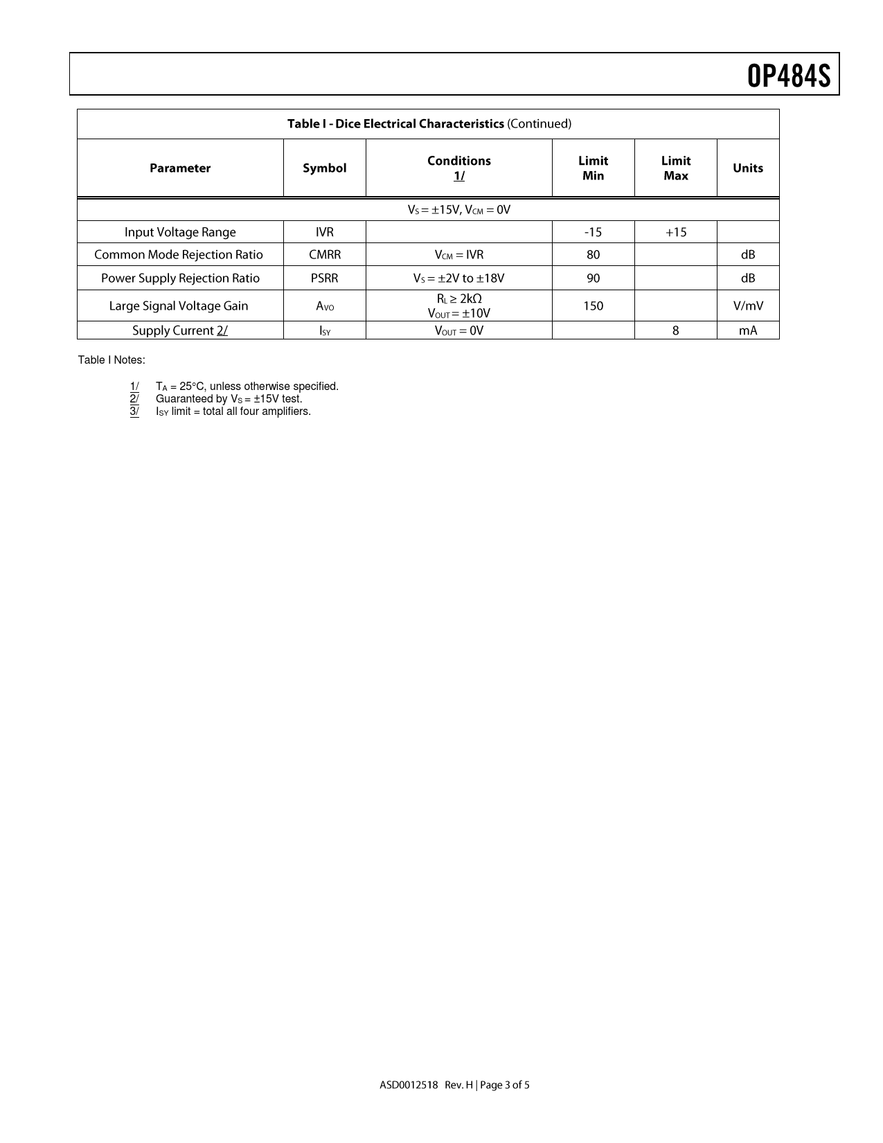 Table I Notes: 1/ TA = 25C, unless otherwise specified. 2/ Guaranteed by VS = ±15V test. 3/ ISY limit = total all four amplifiers.