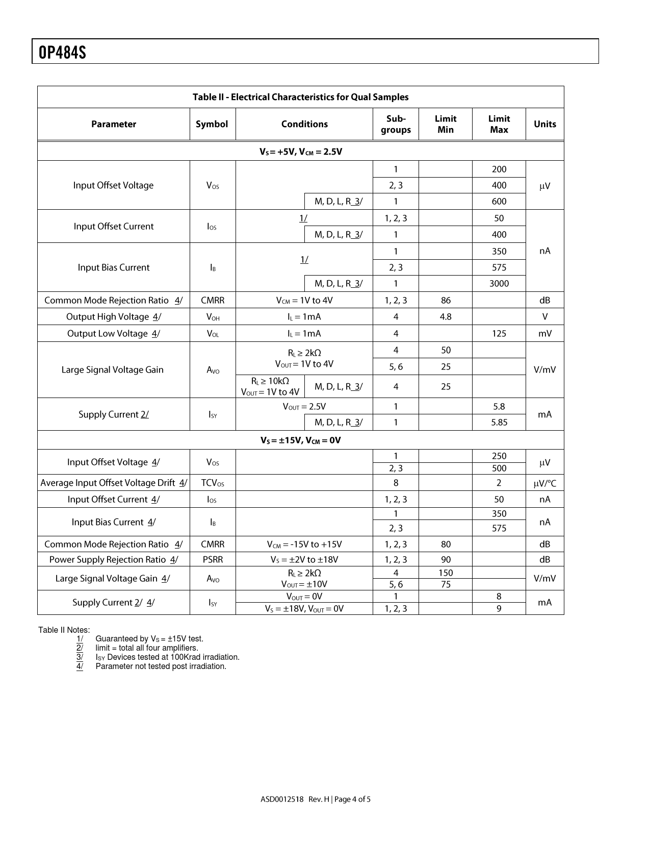 Table II Notes: 1/ Guaranteed by VS = ±15V test. 2/ limit = total all four amplifiers. 3/ ISY Devices tested at 100Krad irradiation. 4/ Parameter not tested post irradiation.