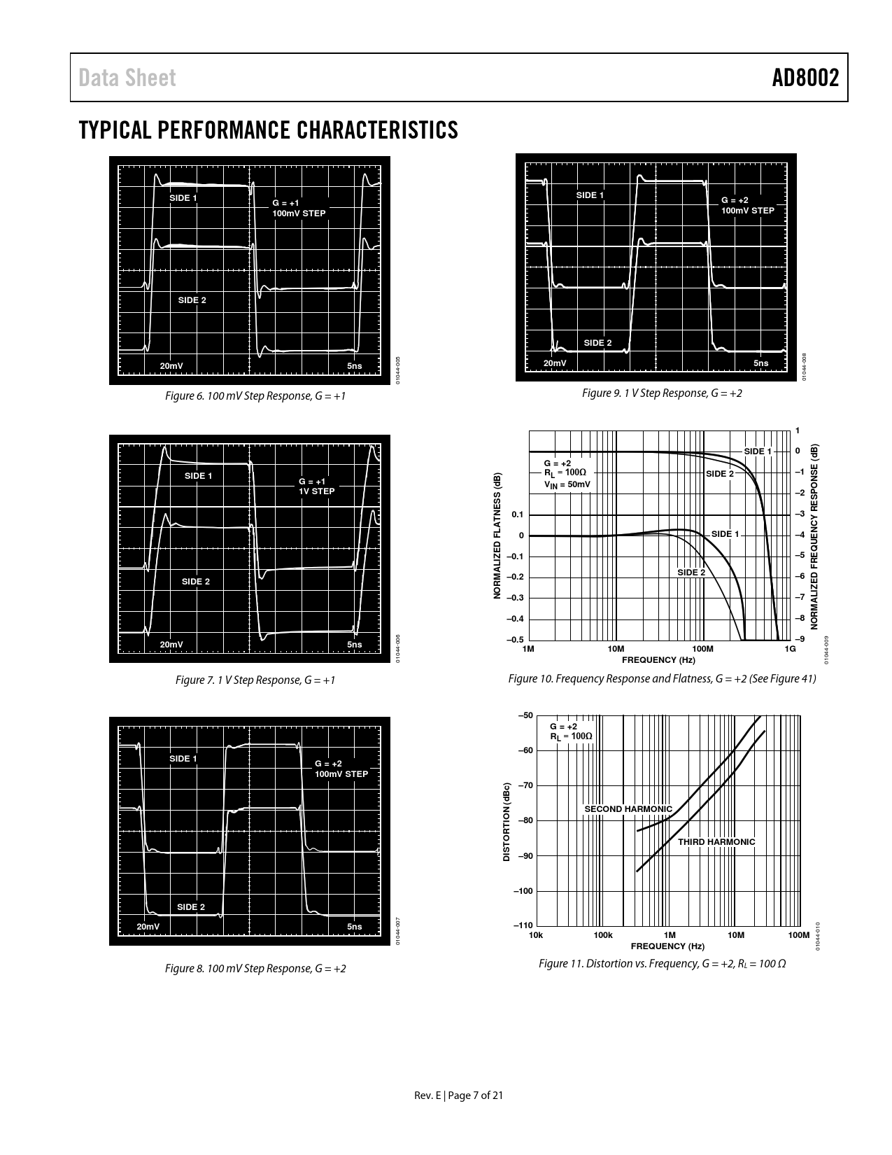 link to page 13 Data SheetAD8002TYPICAL PERFORMANCE CHARACTERISTICSSIDE 1SIDE 1G = +1G = +2100mV STEP100mV STEPSIDE 2SIDE 2 008 005 20mV5ns20mV5ns 01044- 01044- Figure 6. 100 mV Step Response, G = +1 Figure 9. 1 V Step Response, G = +2 10B)SIDE 1d (G = +2E)R–1SIDE 1L = 100ΩSIDE 2G = +1NSdBVIN = 50mVO1V STEP(–2SPSSE0.1–3RETNNCY0SIDE 1–4FLA DUE Q–0.1–5LIZEREASIDE 2M –0.2–6D FSIDE 2EORIZN –0.3–7ALRM–0.4–8NO–9 006 –0.520mV5ns 009 1M10M100M1G 01044- FREQUENCY (Hz) 01044- Figure 7. 1 V Step Response, G = +1 Figure 10. Frequency Response and Flatness, G = +2 (See Figure 41) –50G = +2 RL = 100Ω–60SIDE 1G = +2 100mV STEP–70Bc) (dSECOND HARMONIC–80TIONTORTHIRD HARMONICIS D–90–100SIDE 2 007 20mV5ns–110 010 10k100k1M10M100M 01044- FREQUENCY (Hz) 01044- Figure 8. 100 mV Step Response, G = +2 Figure 11. Distortion vs. Frequency, G = +2, RL = 100 Ω Rev. E | Page 7 of 21 Document Outline Features Applications General Description Pin Connection Block Diagram Table of Contents Revision History Specifications Absolute Maximum Ratings Maximum Power Dissipation ESD Caution Pin Configurations and Function Descriptions Typical Performance Characteristics Test Circuits Theory of Operation Choice of Feedback and Gain Resistors Printed Circuit Board (PCB) Layout Considerations Power Supply Bypassing DC Errors and Noise Driving Capacitive Loads Communications Operation as a Video Line Driver Driving ADCs Single-Ended-to-Differential Driver Using an AD8002 Applications Information Layout Considerations Outline Dimensions Ordering Guide