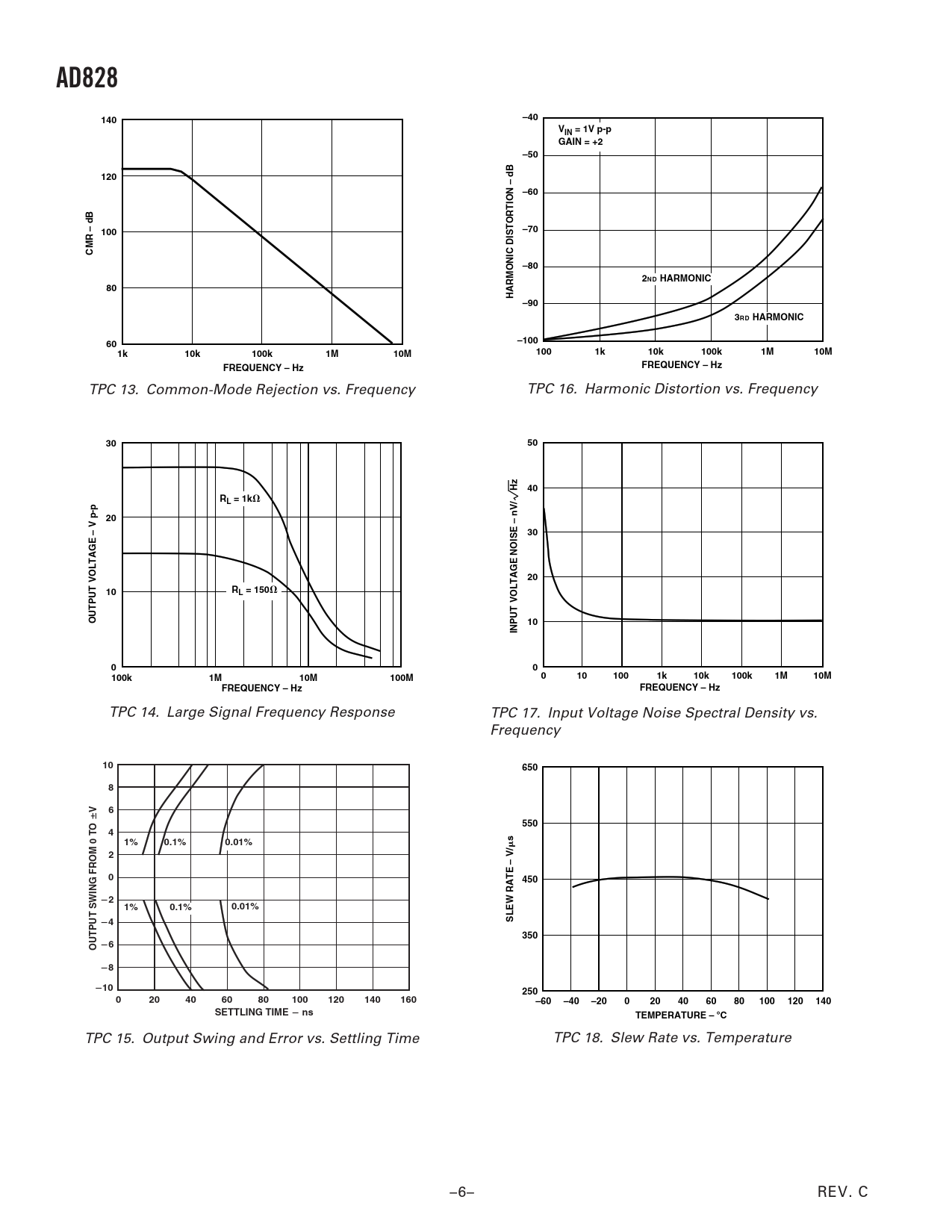 AD828 140 –40 VIN = 1V p-p GAIN = +2 –50 120 –60 100 –70 CMR – dB –80 2ND HARMONIC HARMONIC DISTORTION – dB –90 3RD HARMONIC –100 10k