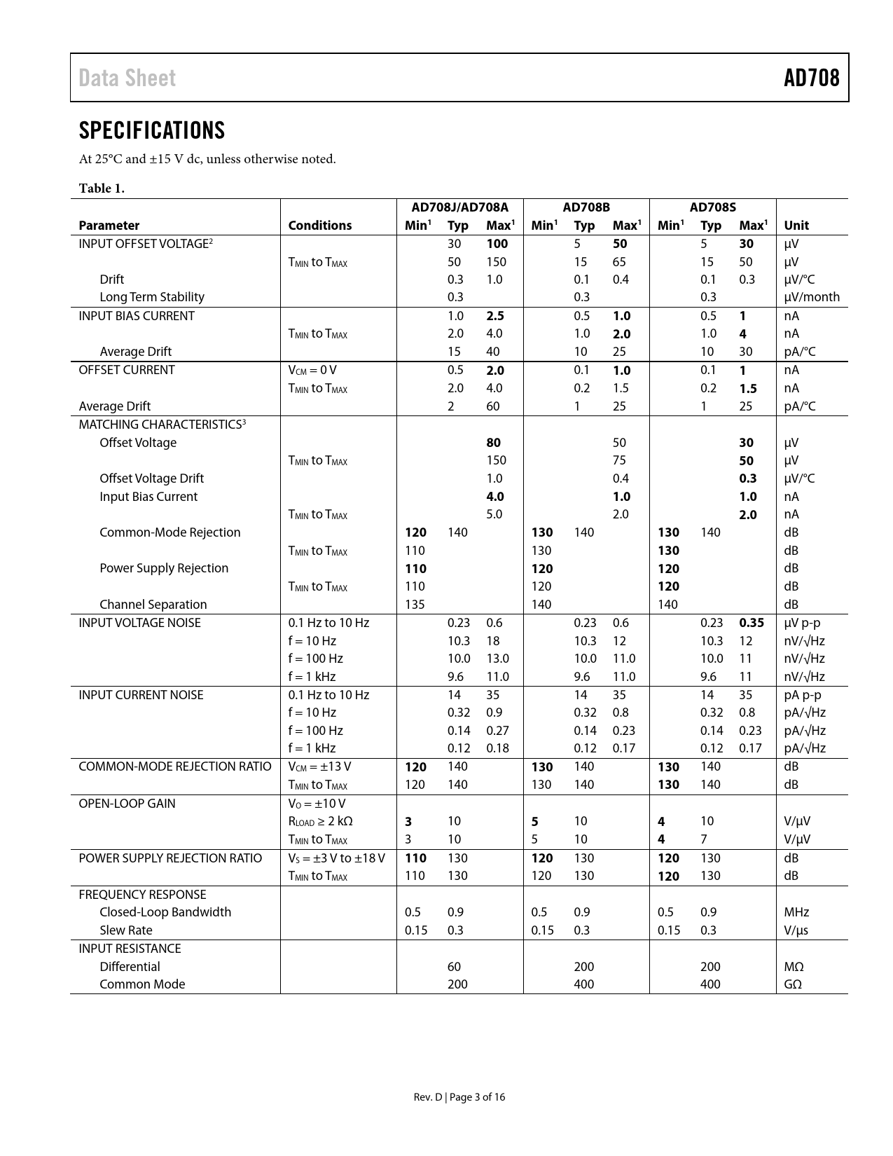 页数 / 页16 / 3 — Data Sheet. AD708. SPECIFICATIONS. Table 1. AD708J/AD708A. AD708B. …