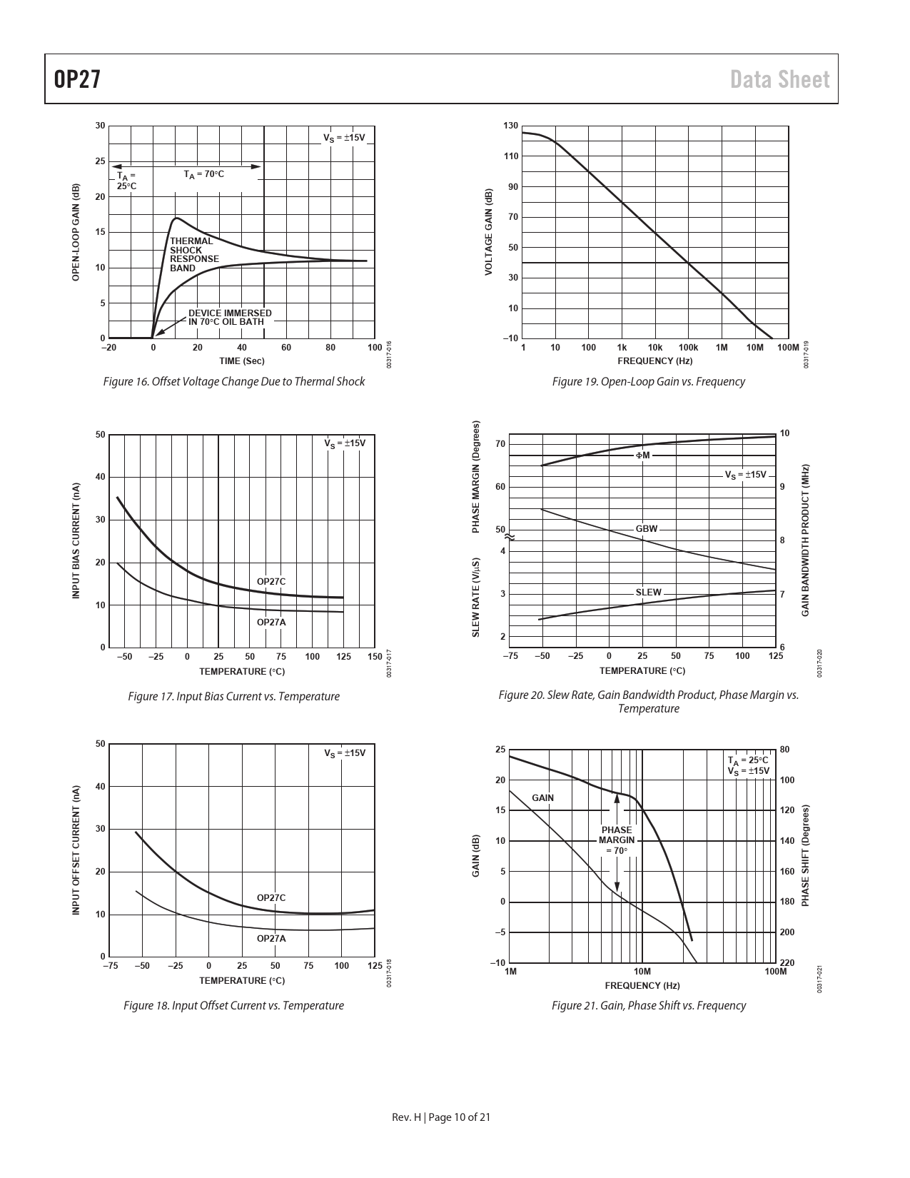 OP27 Data Sheet 30130VS = r 15V11025TTA =A = 70 q C) B25 q C)90B(d20IN(dAIN70GAPG15OEOTHERMALG50-LSHOCKA TRESPONSEL OPEN10BANDVO30510DEVICE IMMERSED IN 70 q C OIL BATH0–10 6 9 –20020406080100 1 1 -0 1101001k10k100k1M10M100M -0 7 7 1 1 TIME (Sec) 3 3 0 FREQUENCY (Hz) 0 0 0 Figure 16. Offset Voltage Change Due to Thermal Shock Figure 19. Open-Loop Gain vs. Frequency ) s e5010reVS = r 15Vg70e ) M(D INz)40GVS = r 15V)RA609(MH T(nMACTUSEDEN30AOR RPH50GBWUPRC8H TS4IDIA20WBDT/ P S)NOP27C(VAPUESLEWBINT37AIN10RA GOP27AEW SL206 7 0 –50–250255075100125150 1 –75–50–250255075100125 2 -0 -0 7 7 1 1 TEMPERATURE ( q C) 3 3 0 TEMPERATURE ( q C) 0 0 0 Figure 17. Input Bias Current vs. Temperature Figure 20. Slew Rate, Gain Bandwidth Product, Phase Margin vs. Temperature 50V2580S = r 15VTA = 25 q C VS = r 15V20100)40AGAIN(n T)15120s eEN RrePHASEgR30)eUB10MARGIN140C(D(d= 70 q T IFINSET FA205160SHFGOSETAOP27CPU0180PHIN10–5200OP27A0 8 –75–50–250255075100125 1 –10220 1 -0 2 7 1M10M100M 1 -0 TEMPERATURE ( q C) 3 7 0 1 0 FREQUENCY (Hz) 3 0 0 Figure 18. Input Offset Current vs. Temperature Figure 21. Gain, Phase Shift vs. Frequency Rev. H | Page 10 of 21