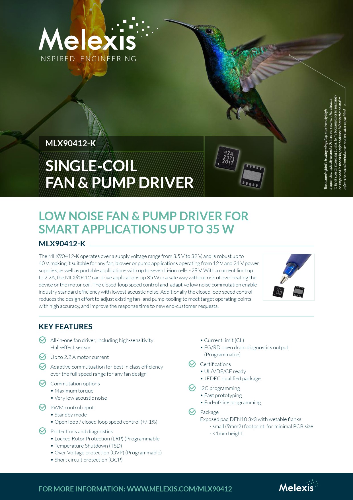 ds or to seemingly emely high xtr MLX90412-K s, to fly backwar er and actuator capacities? ound 50 times per second. This allows it ol driv d’s beating wings flap at e xceeding 15 m/ contr SINGLE-COILFAN & PUMP DRIVER equencies, typically ar The hummingbir fr to fly at speeds e be suspended in the air in perfect balance. What better animal to reflect the motor/ LOW NOISE FAN & PUMP DRIVER FORSMART APPLICATIONS UP TO 35 W MLX90412-K The MLX90412-K operates over a supply voltage range from 3.5 V to 32 V, and is robust up to 40 V, making it suitable for any fan, blower or pump applications operating from 12 V and 24 V power supplies, as well as portable applications with up to seven Li-ion cells ~29 V. With a current limit up to 2.2A, the MLX90412 can drive applications up 35 W in a safe way without risk of overheating the device or the motor coil. The closed-loop speed control and adaptive low noise commutation enable industry standard efficiency with lowest acoustic noise. Additionally the closed loop speed control reduces the design effort to adjust existing fan- and pump-tooling to meet target operating points with high accuracy, and improve the response time to new end-customer requests. KEY FEATURES k All-in-one fan driver, including high-sensitivity • Current limit (CL) Hall-effect sensor • FG/RD open drain diagnostics output k Up to 2.2 A motor current (Programmable) k Adaptive commutuation for best in class efficiency k Certifications over the full speed range for any fan design • UL/VDE/CE ready • JEDEC qualified package k Commutation options • Maximum torque k I2C programming • Very low acoustic noise • Fast prototyping • End-of-line programming k PWM control input • Standby mode k Package • Open loop / closed loop speed control (+/-1%) Exposed pad DFN10 3x3 with wetable flanks - small (9mm2) footprint, for minimal PCB size k Protections and diagnostics - <1mm height • Locked Rotor Protection (LRP) (Programmable • Temperature Shutdown (TSD) • Over Voltage protection (OVP) (Programmable) • Short circuit protection (OCP) FOR MORE INFORMATION: WWW.MELEXIS.COM/MLX90412