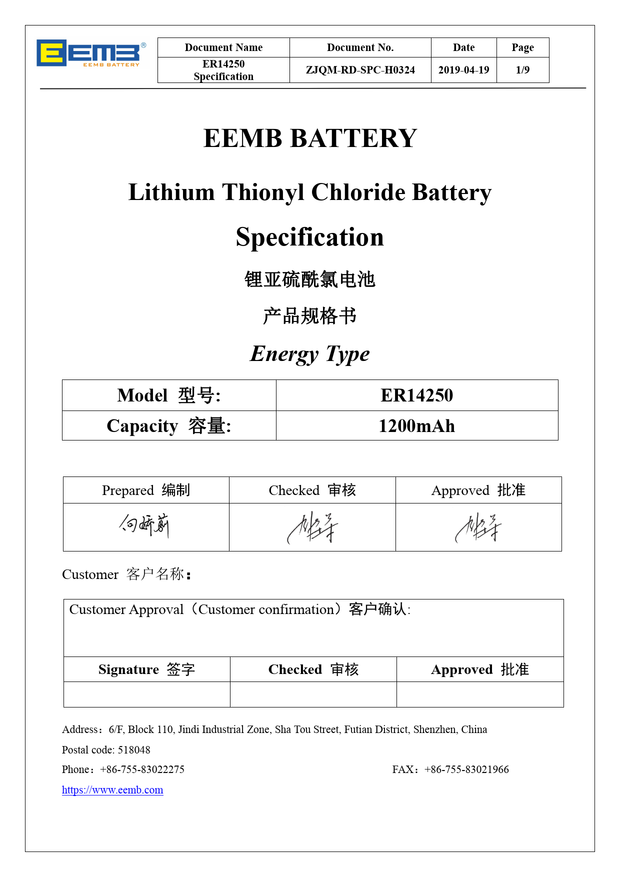 Document Name. Document No. Date. Page. ER14250. Specification. ZJQM-RD-SPC-H0324. 2019-04-19. 1/9. EEMB BATTERY