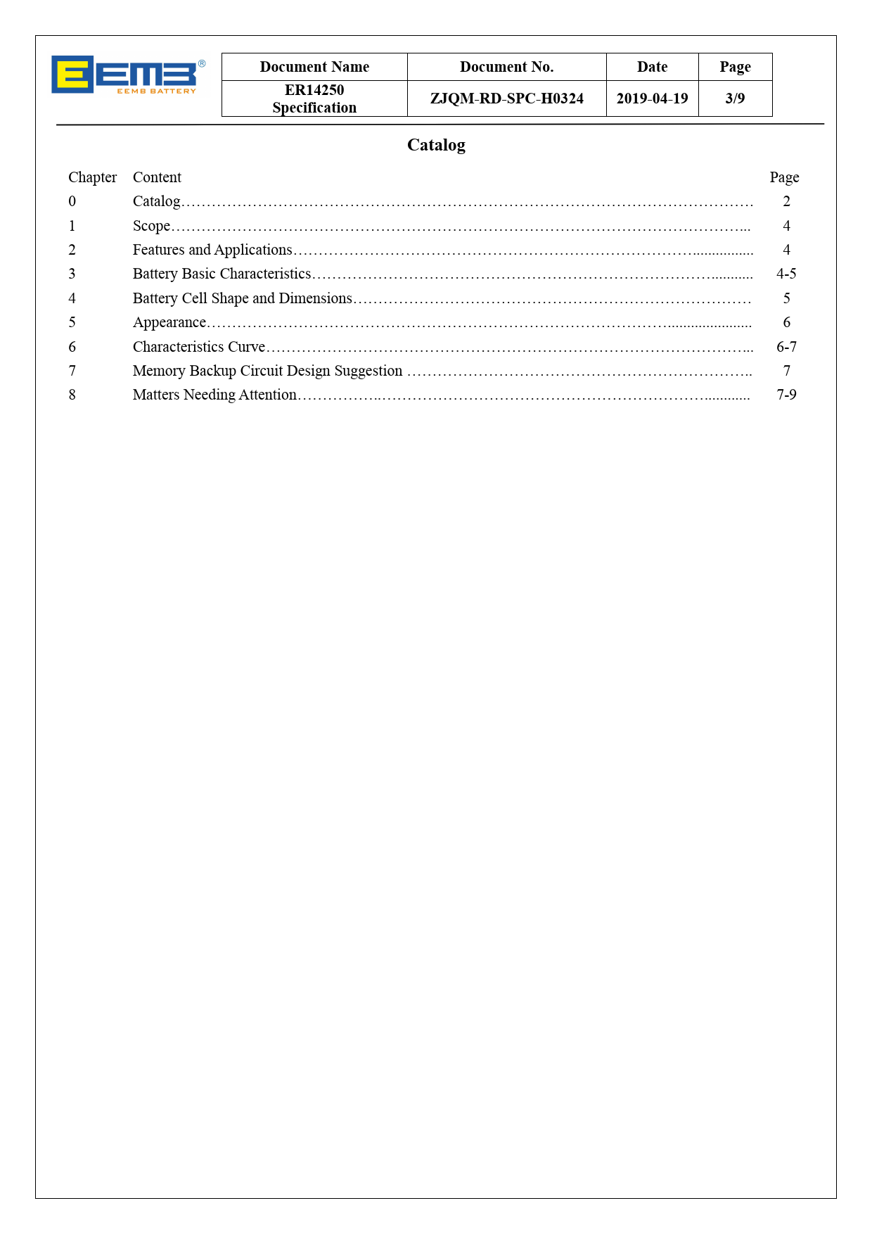 Document Name. Document No. Date. Page. ER14250. Specification. ZJQM-RD-SPC-H0324. 2019-04-19. 3/9. Catalog
