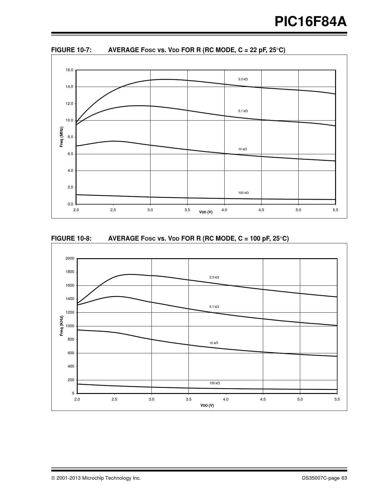 页数 / 页90 / 63 — PIC16F84A. FIGURE 10-7:. AVERAGE FOSC vs. VDD FOR R (RC MODE, C = 22 pF, …