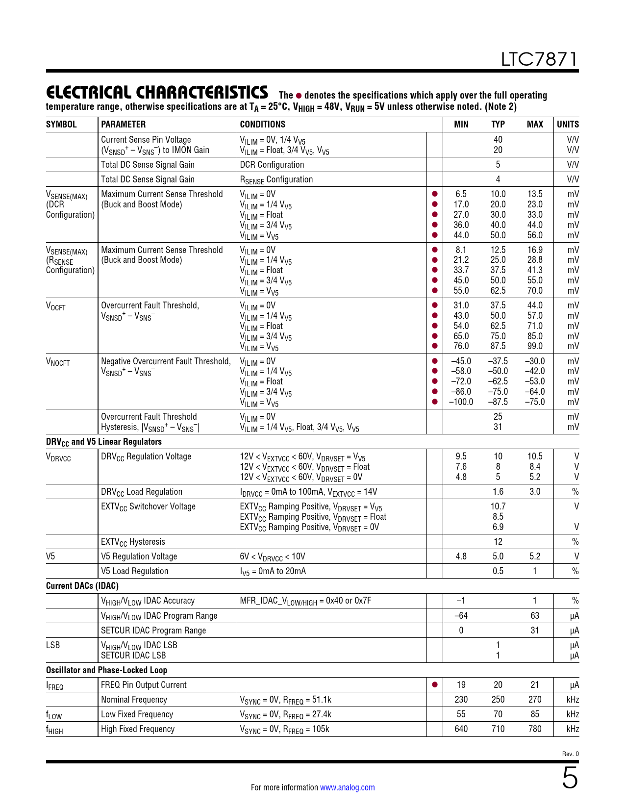 LTC7871 ELECTRICAL CHARACTERISTICSThe l denotes the specifications which apply over the full operatingtemperature range, otherwise specifications are at TA = 25°C, VHIGH = 48V, VRUN = 5V unless otherwise noted. (Note 2) SYMBOLPARAMETERCONDITIONSMINTYPMAXUNITS Current Sense Pin Voltage VILIM = 0V, 1/4 VV5 40 V/V (V + – SNSD – VSNS ) to IMON Gain VILIM = Float, 3/4 VV5, VV5 20 V/V Total DC Sense Signal Gain DCR Configuration 5 V/V Total DC Sense Signal Gain RSENSE Configuration 4 V/V VSENSE(MAX) Maximum Current Sense Threshold VILIM = 0V l 6.5 10.0 13.5 mV (DCR (Buck and Boost Mode) VILIM = 1/4 VV5 l 17.0 20.0 23.0 mV Configuration) VILIM = Float l 27.0 30.0 33.0 mV VILIM = 3/4 VV5 l 36.0 40.0 44.0 mV VILIM = VV5 l 44.0 50.0 56.0 mV VSENSE(MAX) Maximum Current Sense Threshold VILIM = 0V l 8.1 12.5 16.9 mV (RSENSE (Buck and Boost Mode) VILIM = 1/4 VV5 l 21.2 25.0 28.8 mV Configuration) VILIM = Float l 33.7 37.5 41.3 mV VILIM = 3/4 VV5 l 45.0 50.0 55.0 mV VILIM = VV5 l 55.0 62.5 70.0 mV VOCFT Overcurrent Fault Threshold, VILIM = 0V l 31.0 37.5 44.0 mV V + – SNSD – VSNS VILIM = 1/4 VV5 l 43.0 50.0 57.0 mV VILIM = Float l 54.0 62.5 71.0 mV VILIM = 3/4 VV5 l 65.0 75.0 85.0 mV VILIM = VV5 l 76.0 87.5 99.0 mV VNOCFT Negative Overcurrent Fault Threshold, VILIM = 0V l –45.0 –37.5 –30.0 mV V + – SNSD – VSNS VILIM = 1/4 VV5 l –58.0 –50.0 –42.0 mV VILIM = Float l –72.0 –62.5 –53.0 mV VILIM = 3/4 VV5 l –86.0 –75.0 –64.0 mV VILIM = VV5 l –100.0 –87.5 –75.0 mV Overcurrent Fault Threshold VILIM = 0V 25 mV Hysteresis, |V + – SNSD – VSNS | VILIM = 1/4 VV5, Float, 3/4 VV5, VV5 31 mV DRVCC and V5 Linear Regulators VDRVCC DRVCC Regulation Voltage 12V < VEXTVCC < 60V, VDRVSET = VV5 9.5 10 10.5 V 12V < VEXTVCC < 60V, VDRVSET = Float 7.6 8 8.4 V 12V < VEXTVCC < 60V, VDRVSET = 0V 4.8 5 5.2 V DRVCC Load Regulation IDRVCC = 0mA to 100mA, VEXTVCC = 14V 1.6 3.0 % EXTVCC Switchover Voltage EXTVCC Ramping Positive, VDRVSET = VV5 10.7 V EXTVCC Ramping Positive, VDRVSET = Float 8.5 EXTVCC Ramping Positive, VDRVSET = 0V 6.9 V EXTVCC Hysteresis 12 % V5 V5 Regulation Voltage 6V < VDRVCC < 10V 4.8 5.0 5.2 V V5 Load Regulation IV5 = 0mA to 20mA 0.5 1 % Current DACs (IDAC) VHIGH/VLOW IDAC Accuracy MFR_IDAC_VLOW/HIGH = 0x40 or 0x7F –1 1 % VHIGH/VLOW IDAC Program Range –64 63 µA SETCUR IDAC Program Range 0 31 µA LSB VHIGH/VLOW IDAC LSB 1 µA SETCUR IDAC LSB 1 µA Oscillator and Phase-Locked Loop IFREQ FREQ Pin Output Current l 19 20 21 µA Nominal Frequency VSYNC = 0V, RFREQ = 51.1k 230 250 270 kHz fLOW Low Fixed Frequency VSYNC = 0V, RFREQ = 27.4k 55 70 85 kHz fHIGH High Fixed Frequency VSYNC = 0V, RFREQ = 105k 640 710 780 kHz Rev. 0 For more information www.analog.com 5 Document Outline Features Applications Typical Application Description Absolute Maximum Ratings Order Information Pin Configuration Electrical Characteristics Typical Performance Characteristics Pin Functions Block Diagram Operation Applications Information Serial Port Serial Port Register Details Typical Applications Package Description Typical Application Related Parts