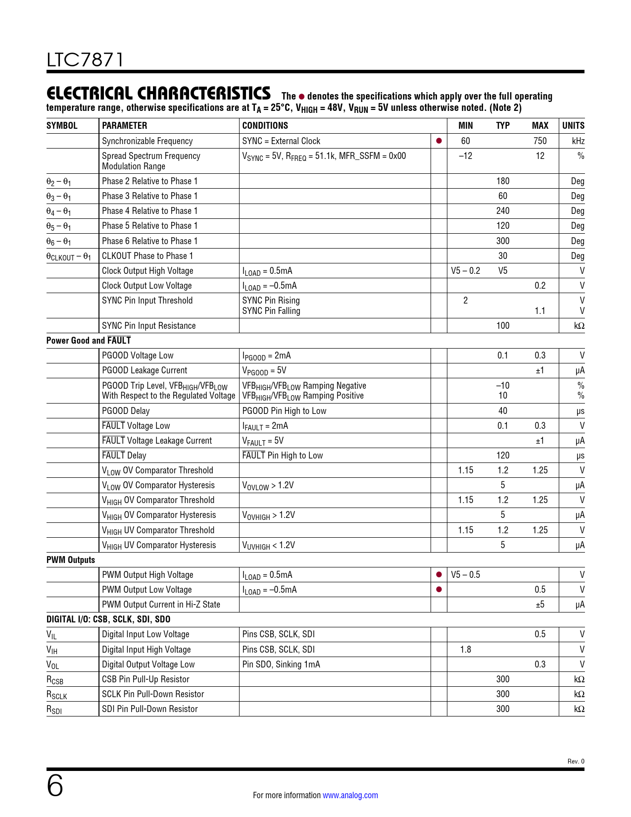 LTC7871 ELECTRICAL CHARACTERISTICSThe l denotes the specifications which apply over the full operatingtemperature range, otherwise specifications are at TA = 25°C, VHIGH = 48V, VRUN = 5V unless otherwise noted. (Note 2) SYMBOLPARAMETERCONDITIONSMINTYPMAXUNITS Synchronizable Frequency SYNC = External Clock l 60 750 kHz Spread Spectrum Frequency VSYNC = 5V, RFREQ = 51.1k, MFR_SSFM = 0x00 –12 12 % Modulation Range θ2 – θ1 Phase 2 Relative to Phase 1 180 Deg θ3 – θ1 Phase 3 Relative to Phase 1 60 Deg θ4 – θ1 Phase 4 Relative to Phase 1 240 Deg θ5 – θ1 Phase 5 Relative to Phase 1 120 Deg θ6 – θ1 Phase 6 Relative to Phase 1 300 Deg θCLKOUT – θ1 CLKOUT Phase to Phase 1 30 Deg Clock Output High Voltage ILOAD = 0.5mA V5 – 0.2 V5 V Clock Output Low Voltage ILOAD = –0.5mA 0.2 V SYNC Pin Input Threshold SYNC Pin Rising 2 V SYNC Pin Falling 1.1 V SYNC Pin Input Resistance 100 kΩ Power Good and FAULT PGOOD Voltage Low IPGOOD = 2mA 0.1 0.3 V PGOOD Leakage Current VPGOOD = 5V ±1 µA PGOOD Trip Level, VFBHIGH/VFBLOW VFBHIGH/VFBLOW Ramping Negative –10 % With Respect to the Regulated Voltage VFBHIGH/VFBLOW Ramping Positive 10 % PGOOD Delay PGOOD Pin High to Low 40 µs FAULT Voltage Low IFAULT = 2mA 0.1 0.3 V FAULT Voltage Leakage Current VFAULT = 5V ±1 µA FAULT Delay FAULT Pin High to Low 120 µs VLOW OV Comparator Threshold 1.15 1.2 1.25 V VLOW OV Comparator Hysteresis VOVLOW > 1.2V 5 µA VHIGH OV Comparator Threshold 1.15 1.2 1.25 V VHIGH OV Comparator Hysteresis VOVHIGH > 1.2V 5 µA VHIGH UV Comparator Threshold 1.15 1.2 1.25 V VHIGH UV Comparator Hysteresis VUVHIGH < 1.2V 5 µA PWM Outputs PWM Output High Voltage ILOAD = 0.5mA l V5 – 0.5 V PWM Output Low Voltage ILOAD = –0.5mA l 0.5 V PWM Output Current in Hi-Z State ±5 µA DIGITAL I/O: CSB, SCLK, SDI, SDO VIL Digital Input Low Voltage Pins CSB, SCLK, SDI 0.5 V VIH Digital Input High Voltage Pins CSB, SCLK, SDI 1.8 V VOL Digital Output Voltage Low Pin SDO, Sinking 1mA 0.3 V RCSB CSB Pin Pull-Up Resistor 300 kΩ RSCLK SCLK Pin Pull-Down Resistor 300 kΩ RSDI SDI Pin Pull-Down Resistor 300 kΩ Rev. 0 6 For more information www.analog.com Document Outline Features Applications Typical Application Description Absolute Maximum Ratings Order Information Pin Configuration Electrical Characteristics Typical Performance Characteristics Pin Functions Block Diagram Operation Applications Information Serial Port Serial Port Register Details Typical Applications Package Description Typical Application Related Parts