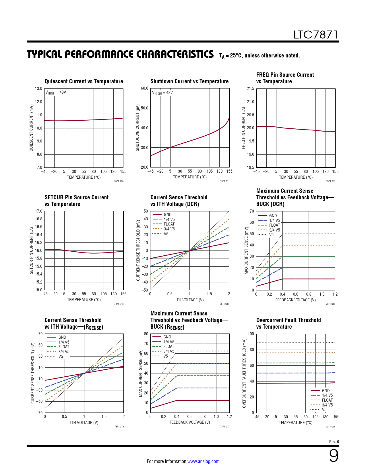 17.0 50 70 GND GND 16.8 40 1/4 V5 1/4 V5 FLOAT 60 16.6 30 FLOAT 3/4 V5 3/4 V5 16.4 20 V5 50 V5 16.2 10 40 16.0 0 15.8 –10 30 15.6 –20 20 SETCUR PIN CURRENT (µA) 15.4 –30 MAX CURRENT SENSE (mV) 10 15.2 CURRENT SENSE THRESHOLD (mV) –40 15.0 –50 0 –45 –20 5 30 55 80 105 130 155 0 0.5 1 1.5 2 0 0.2 0.4 0.6 0.8 1.0 1.2 TEMPERATURE (°C) ITH VOLTAGE (V) FEEDBACK VOLTAGE (V) 7871 G13 7871 G14 7871 G15