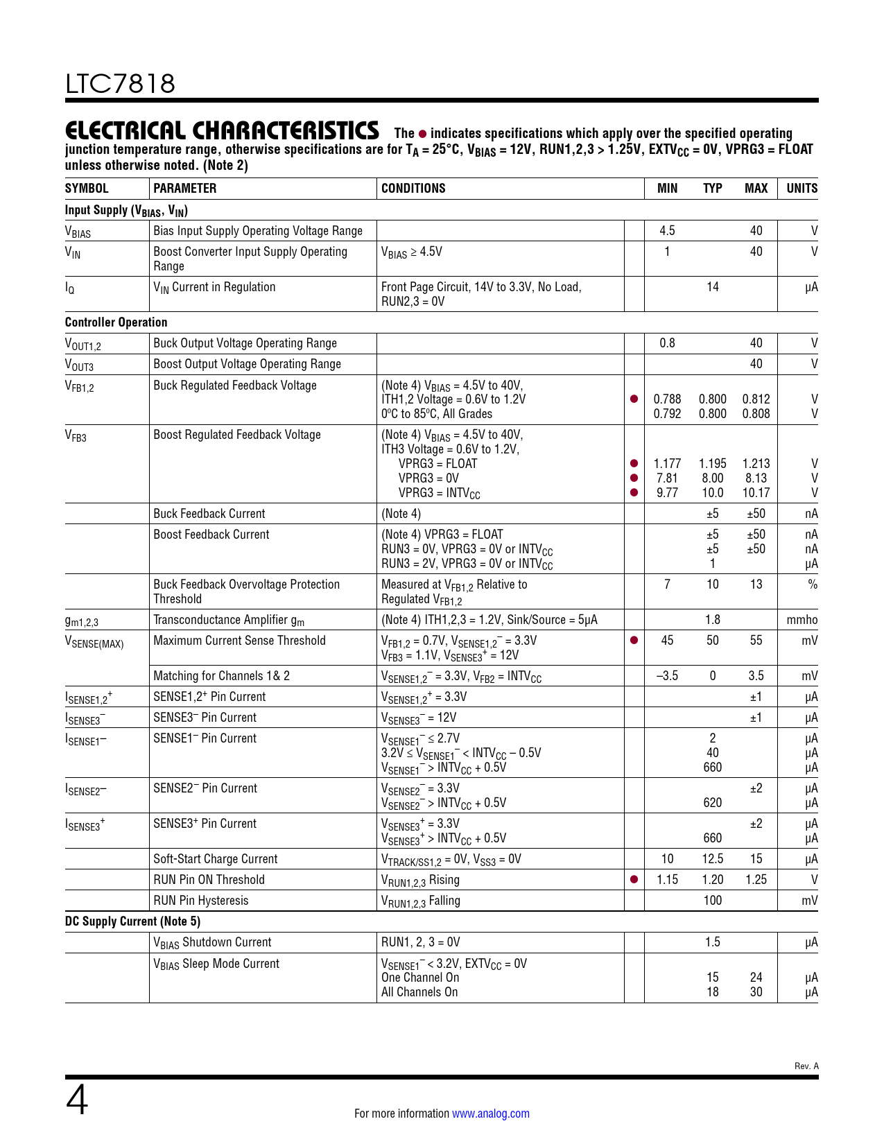 VOUT1,2 Buck Output Voltage Operating Range 0.8 40 V VOUT3 Boost Output Voltage Operating Range 40 V VFB1,2 Buck Regulated Feedback Voltage (Note 4) VBIAS = 4.5V to 40V, ITH1,2 Voltage = 0.6V to 1.2V l 0.788 0.800 0.812 V 0ºC to 85ºC, All Grades 0.792 0.800 0.808 V VFB3 Boost Regulated Feedback Voltage (Note 4) VBIAS = 4.5V to 40V, ITH3 Voltage = 0.6V to 1.2V, VPRG3 = FLOAT l 1.177 1.195 1.213 V VPRG3 = 0V l 7.81 8.00 8.13 V VPRG3 = INTVCC l 9.77 10.0 10.17 V Buck Feedback Current (Note 4) ±5 ±50 nA Boost Feedback Current (Note 4) VPRG3 = FLOAT ±5 ±50 nA RUN3 = 0V, VPRG3 = 0V or INTVCC ±5 ±50 nA RUN3 = 2V, VPRG3 = 0V or INTVCC 1 µA Buck Feedback Overvoltage Protection Measured at VFB1,2 Relative to 7 10 13 % Threshold Regulated VFB1,2 gm1,2,3 Transconductance Amplifier gm (Note 4) ITH1,2,3 = 1.2V, Sink/Source = 5μA 1.8 mmho V – SENSE(MAX) Maximum Current Sense Threshold VFB1,2 = 0.7V, VSENSE1,2 = 3.3V l 45 50 55 mV V + FB3 = 1.1V, VSENSE3 = 12V Matching for Channels 1& 2 V – SENSE1,2 = 3.3V, VFB2 = INTVCC –3.5 0 3.5 mV I + + SENSE1,2 SENSE1,2+ Pin Current VSENSE1,2 = 3.3V ±1 µA I – – SENSE3 SENSE3– Pin Current VSENSE3 = 12V ±1 µA I – SENSE1– SENSE1– Pin Current VSENSE1 ≤ 2.7V 2 µA 3.2V ≤ V – SENSE1 < INTVCC – 0.5V 40 µA V – SENSE1 > INTVCC + 0.5V 660 µA I – SENSE2– SENSE2– Pin Current VSENSE2 = 3.3V ±2 µA V – SENSE2 > INTVCC + 0.5V 620 µA I + + SENSE3 SENSE3+ Pin Current VSENSE3 = 3.3V ±2 µA V + SENSE3 > INTVCC + 0.5V 660 µA Soft-Start Charge Current VTRACK/SS1,2 = 0V, VSS3 = 0V 10 12.5 15 µA RUN Pin ON Threshold VRUN1,2,3 Rising l 1.15 1.20 1.25 V RUN Pin Hysteresis VRUN1,2,3 Falling 100 mV