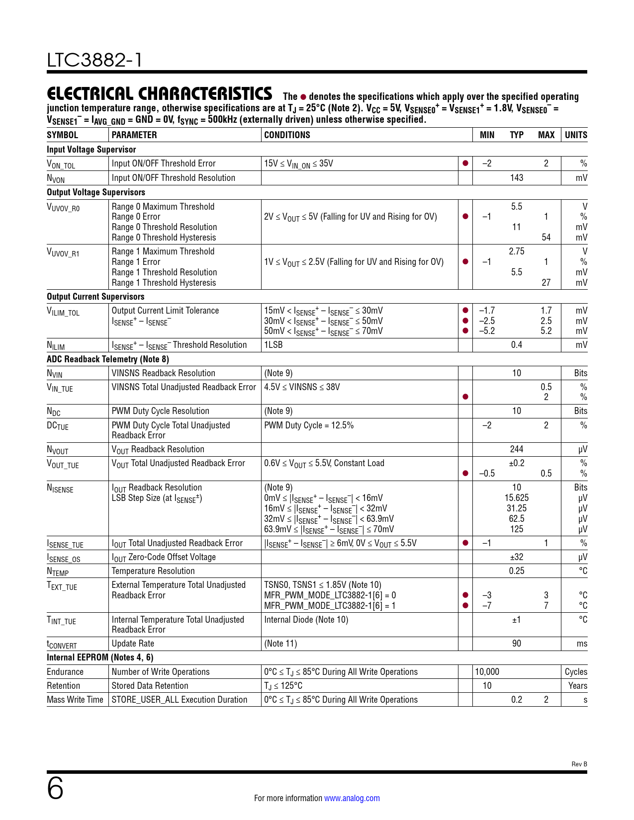 NVIN VINSNS Readback Resolution (Note 9) 10 Bits VIN_TUE VINSNS Total Unadjusted Readback Error 4.5V ≤ VINSNS ≤ 38V 0.5 % l 2 % NDC PWM Duty Cycle Resolution (Note 9) 10 Bits DCTUE PWM Duty Cycle Total Unadjusted PWM Duty Cycle = 12.5% –2 2 % Readback Error NVOUT VOUT Readback Resolution 244 µV VOUT_TUE VOUT Total Unadjusted Readback Error 0.6V ≤ VOUT ≤ 5.5V, Constant Load ±0.2 % l –0.5 0.5 % NISENSE IOUT Readback Resolution (Note 9) 10 Bits LSB Step Size (at I ± + – SENSE ) 0mV ≤ |ISENSE – ISENSE | < 16mV 15.625 µV 16mV ≤ |I + – SENSE – ISENSE | < 32mV 31.25 µV 32mV ≤ |I + – SENSE – ISENSE | < 63.9mV 62.5 µV 63.9mV ≤ |I + – SENSE – ISENSE | ≤ 70mV 125 µV I + – SENSE_TUE IOUT Total Unadjusted Readback Error |ISENSE – ISENSE | ≥ 6mV, 0V ≤ VOUT ≤ 5.5V l –1 1 % ISENSE_OS IOUT Zero-Code Offset Voltage ±32 µV NTEMP Temperature Resolution 0.25 °C TEXT_TUE External Temperature Total Unadjusted TSNS0, TSNS1 ≤ 1.85V (Note 10) Readback Error MFR_PWM_MODE_LTC3882-1[6] = 0 l –3 3 °C MFR_PWM_MODE_LTC3882-1[6] = 1 l –7 7 °C TINT_TUE Internal Temperature Total Unadjusted Internal Diode (Note 10) ±1 °C Readback Error tCONVERT Update Rate (Note 11) 90 ms