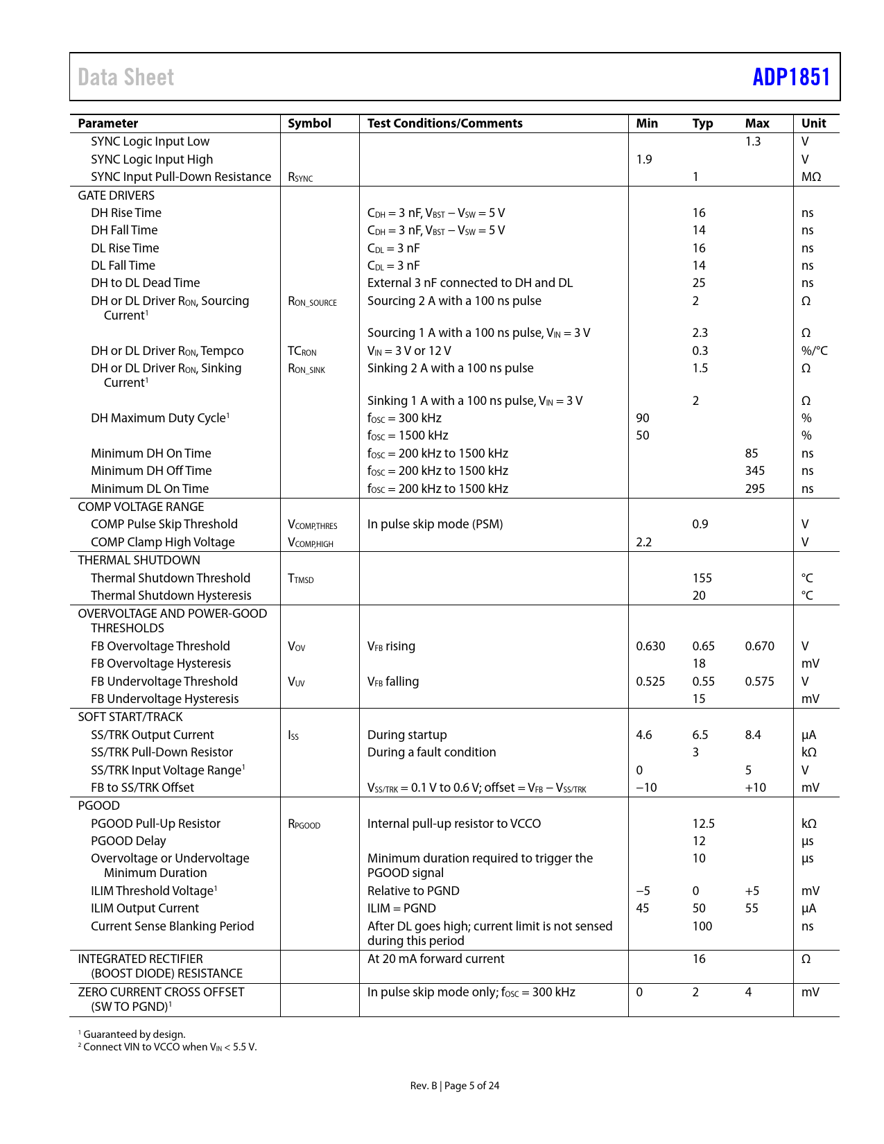 Data SheetADP1851ParameterSymbolTest Conditions/CommentsMinTypMaxUnit SYNC Logic Input Low 1.3 V SYNC Logic Input High 1.9 V SYNC Input Pull-Down Resistance RSYNC 1 MΩ GATE DRIVERS DH Rise Time CDH = 3 nF, VBST − VSW = 5 V 16 ns DH Fall Time CDH = 3 nF, VBST − VSW = 5 V 14 ns DL Rise Time CDL = 3 nF 16 ns DL Fall Time CDL = 3 nF 14 ns DH to DL Dead Time External 3 nF connected to DH and DL 25 ns DH or DL Driver RON, Sourcing RON_SOURCE Sourcing 2 A with a 100 ns pulse 2 Ω Current1 Sourcing 1 A with a 100 ns pulse, VIN = 3 V 2.3 Ω DH or DL Driver RON, Tempco TCRON VIN = 3 V or 12 V 0.3 %/°C DH or DL Driver RON, Sinking RON_SINK Sinking 2 A with a 100 ns pulse 1.5 Ω Current1 Sinking 1 A with a 100 ns pulse, VIN = 3 V 2 Ω DH Maximum Duty Cycle1 fOSC = 300 kHz 90 % fOSC = 1500 kHz 50 % Minimum DH On Time fOSC = 200 kHz to 1500 kHz 85 ns Minimum DH Off Time fOSC = 200 kHz to 1500 kHz 345 ns Minimum DL On Time fOSC = 200 kHz to 1500 kHz 295 ns COMP VOLTAGE RANGE COMP Pulse Skip Threshold VCOMP,THRES In pulse skip mode (PSM) 0.9 V COMP Clamp High Voltage VCOMP,HIGH 2.2 V THERMAL SHUTDOWN Thermal Shutdown Threshold TTMSD 155 °C Thermal Shutdown Hysteresis 20 °C OVERVOLTAGE AND POWER-GOOD THRESHOLDS FB Overvoltage Threshold VOV VFB rising 0.630 0.65 0.670 V FB Overvoltage Hysteresis 18 mV FB Undervoltage Threshold VUV VFB falling 0.525 0.55 0.575 V FB Undervoltage Hysteresis 15 mV SOFT START/TRACK SS/TRK Output Current ISS During startup 4.6 6.5 8.4 µA SS/TRK Pull-Down Resistor During a fault condition 3 kΩ SS/TRK Input Voltage Range1 0 5 V FB to SS/TRK Offset VSS/TRK = 0.1 V to 0.6 V; offset = VFB − VSS/TRK −10 +10 mV PGOOD PGOOD Pull-Up Resistor RPGOOD Internal pull-up resistor to VCCO 12.5 kΩ PGOOD Delay 12 µs Overvoltage or Undervoltage Minimum duration required to trigger the 10 µs Minimum Duration PGOOD signal ILIM Threshold Voltage1 Relative to PGND −5 0 +5 mV ILIM Output Current ILIM = PGND 45 50 55 µA Current Sense Blanking Period After DL goes high; current limit is not sensed 100 ns during this period INTEGRATED RECTIFIER At 20 mA forward current 16 Ω (BOOST DIODE) RESISTANCE ZERO CURRENT CROSS OFFSET In pulse skip mode only; fOSC = 300 kHz 0 2 4 mV (SW TO PGND)1 1 Guaranteed by design. 2 Connect VIN to VCCO when VIN < 5.5 V. Rev. B | Page 5 of 24 Document Outline FEATURES APPLICATIONS GENERAL DESCRIPTION TYPICAL OPERATION CIRCUIT REVISION HISTORY SIMPLIFIED BLOCK DIAGRAM SPECIFICATIONS ABSOLUTE MAXIMUM RATINGS ESD CAUTION PIN CONFIGURATION AND FUNCTION DESCRIPTIONS TYPICAL PERFORMANCE CHARACTERISTICS THEORY OF OPERATION CONTROL ARCHITECTURE OSCILLATOR FREQUENCY SYNCHRONIZATION PWM AND PULSE SKIP MODES OF OPERATION SYNCHRONOUS RECTIFIER AND DEAD TIME INPUT UNDERVOLTAGE LOCKOUT INTERNAL LINEAR REGULATOR OVERVOLTAGE PROTECTION POWER GOOD SHORT-CIRCUIT AND CURRENT-LIMIT PROTECTION ENABLE/DISABLE CONTROL THERMAL OVERLOAD PROTECTION APPLICATIONS INFORMATION ADIsimPower DESIGN TOOL SETTING THE OUTPUT VOLTAGE SOFT START SETTING THE CURRENT LIMIT ACCURATE CURRENT-LIMIT SENSING INPUT CAPACITOR SELECTION VIN PIN FILTER BOOST CAPACITOR SELECTION INDUCTOR SELECTION OUTPUT CAPACITOR SELECTION MOSFET SELECTION LOOP COMPENSATION—VOLTAGE MODE Type III Compensation LOOP COMPENSATION—CURRENT MODE Setting the Slope Compensation Setting the Current Sense Gain Type II Compensation SWITCHING NOISE AND OVERSHOOT REDUCTION VOLTAGE TRACKING Coincident Tracking Ratiometric Tracking PCB LAYOUT GUIDELINES TYPICAL OPERATING CIRCUITS OUTLINE DIMENSIONS ORDERING GUIDE