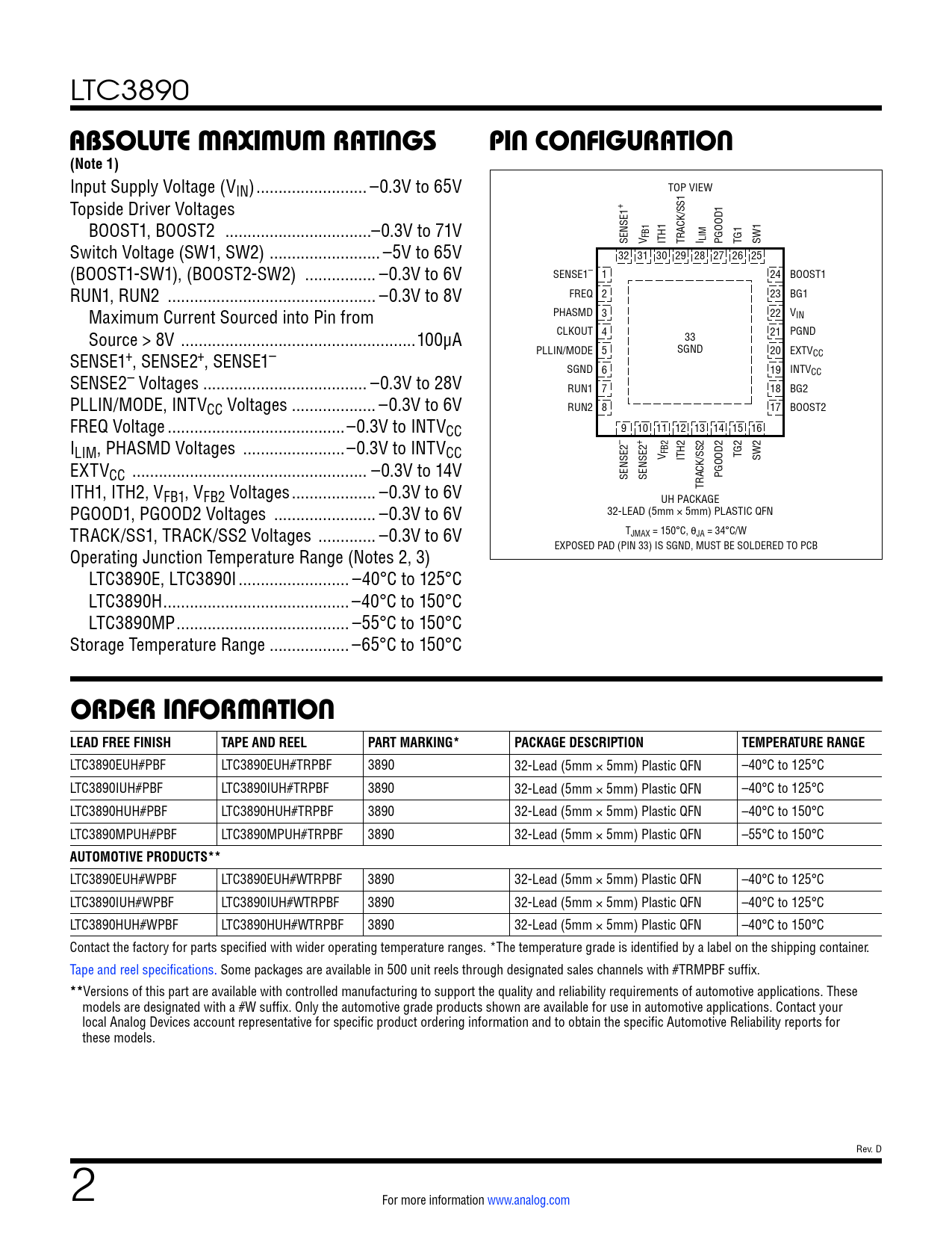 LTC3890EUH#PBF LTC3890EUH#TRPBF 3890 32-Lead (5mm × 5mm) Plastic QFN –40°C to 125°C LTC3890IUH#PBF LTC3890IUH#TRPBF 3890 32-Lead (5mm × 5mm) Plastic QFN –40°C to 125°C LTC3890HUH#PBF LTC3890HUH#TRPBF 3890 32-Lead (5mm × 5mm) Plastic QFN –40°C to 150°C LTC3890MPUH#PBF LTC3890MPUH#TRPBF 3890 32-Lead (5mm × 5mm) Plastic QFN –55°C to 150°C