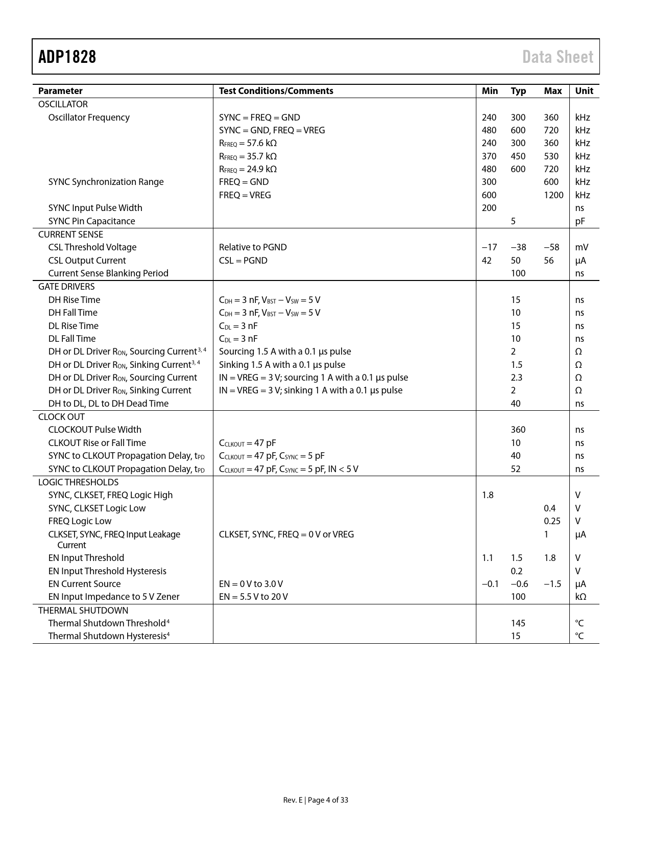 页数 / 页33 / 4 — ADP1828. Data Sheet. Parameter. Test Conditions/Comments. Min Typ. Max. …