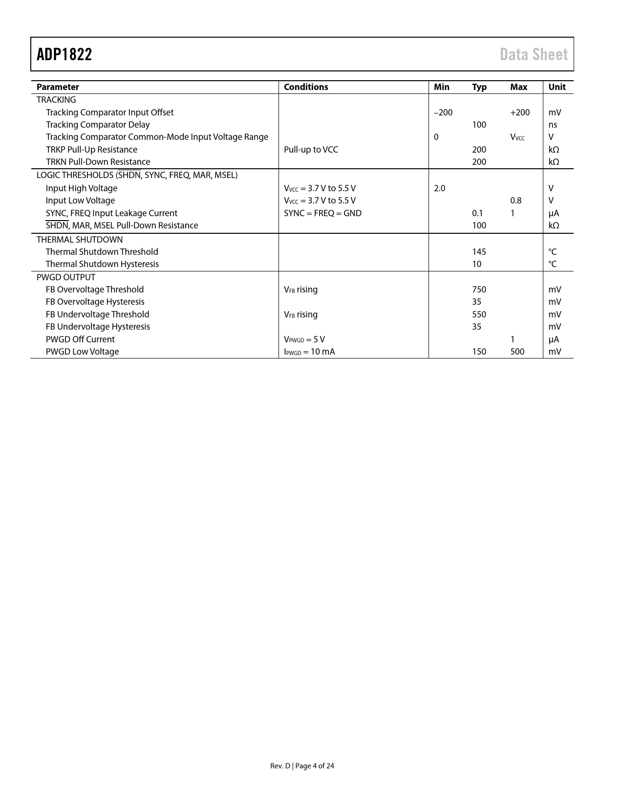 页数 / 页24 / 4 — ADP1822. Data Sheet. Parameter. Conditions. Min. Typ. Max. Unit