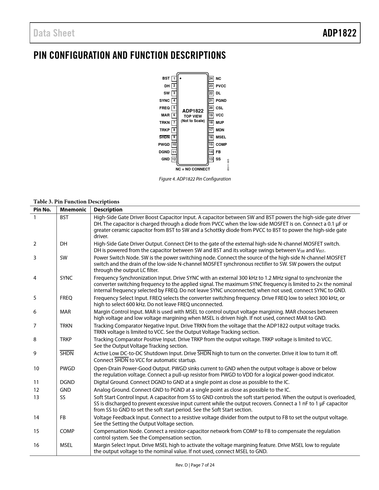 Data Sheet ADP1822 PIN CONFIGURATION AND FUNCTION DESCRIPTIONS BST 1 24 NC DH 2 23 PVCC SW 3 22 DL SYNC 4 21 PGND FREQ 5 20 CSL ADP1822 MAR 6 19 VCC TOP VIEW (Not to Scale) TRKN 7 18 MUP TRKP 8 17 MDN SHDN 9 16 MSEL PWGD 10 15 COMP DGND 11 14 FB GND 12 13 SS NC = NO CONNECT