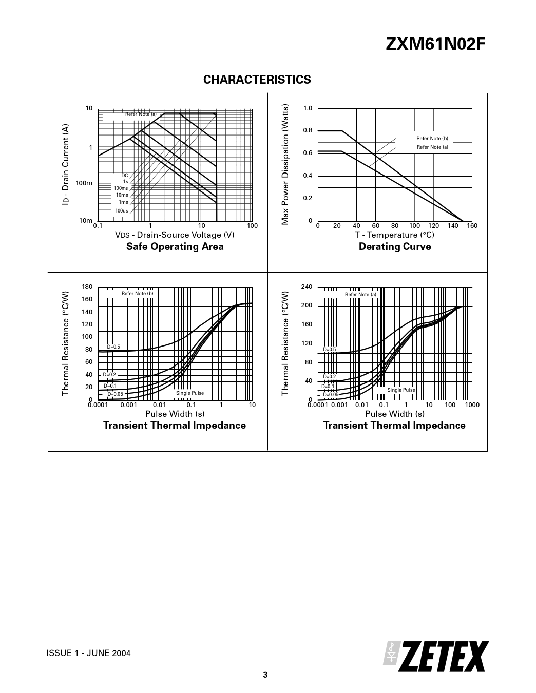 ZXM61N02FCHARACTERISTICS ) 10 1.0 Refer Note (a) tts a ) A 0.8 Refer Note (b) nt ( 1 tion (W re Refer Note (a) 0.6 ipa s is in Cur DC 0.4 ra 100m 1s r D 100ms e - D 10ms 0.2 ID 1ms Pow 100us x 10m 0 0.1 1 10 100 Ma 0 20 40 60 80 100 120 140 160 VDS - Drain-Source Voltage (V) T - Temperature (°C) Safe Operating AreaDerating Curve 180 240 ) Refer Note (b) Refer Note (a) /W 160 /W 200 °C 140 °C ( ce 120 ce 160 an an 100 ist ist 120 s s e 80 D=0.5 e D=0.5 l R 60 l R 80 a a 40 D=0.2 rm rm D=0.2 e e 40 D=0.1 h 20 h D=0.1 T Single Pulse D=0.05 Single Pulse T D=0.05 0 0 0.0001 0.001 0.01 0.1 1 10 0.0001 0.001 0.01 0.1 1 10 100 1000 Pulse Width (s) Pulse Width (s) Transient Thermal ImpedanceTransient Thermal Impedance ISSUE 1 - JUNE 2004 3