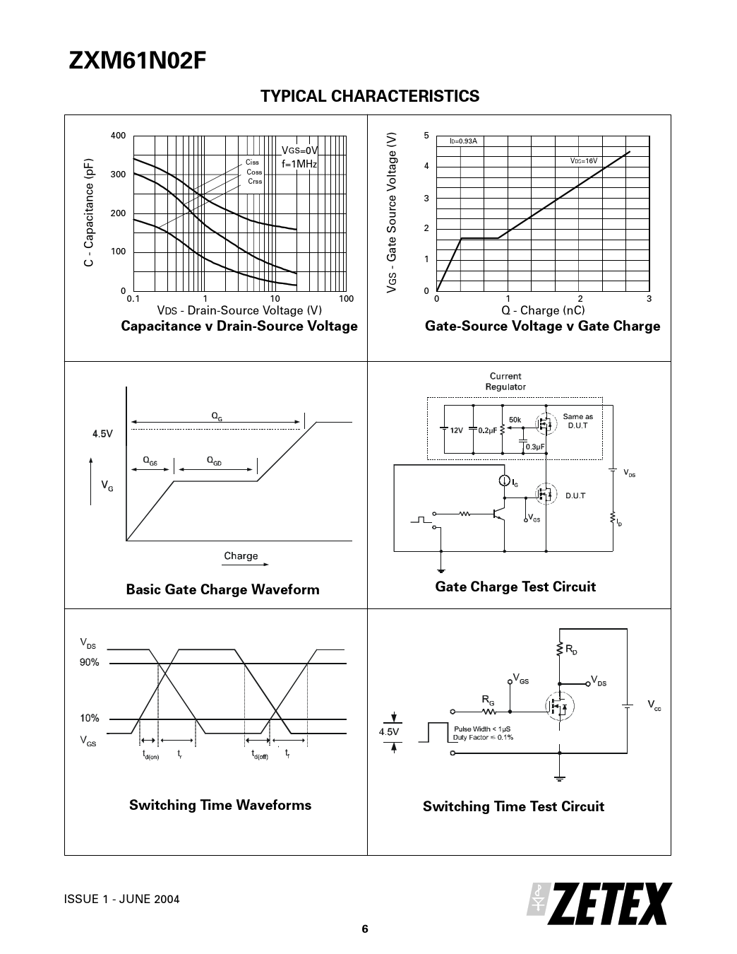 ZXM61N02FTYPICAL CHARACTERISTICS 400 5 ID=0.93A (V) VGS=0V ) e Ciss g VDS=16V f=1MHz 4 Coss (pF 300 Crss e olta V nc e 3 c ita c 200 pa Sour 2 te 100 a C - Ca 1 - G GS 0 V 0 0.1 1 10 100 0 1 2 3 VDS - Drain-Source Voltage (V) Q - Charge (nC) Capacitance v Drain-Source VoltageGate-Source Voltage v Gate ChargeBasic Gate Charge WaveformGate Charge Test CircuitSwitching Time WaveformsSwitching Time Test Circuit ISSUE 1 - JUNE 2004 6
