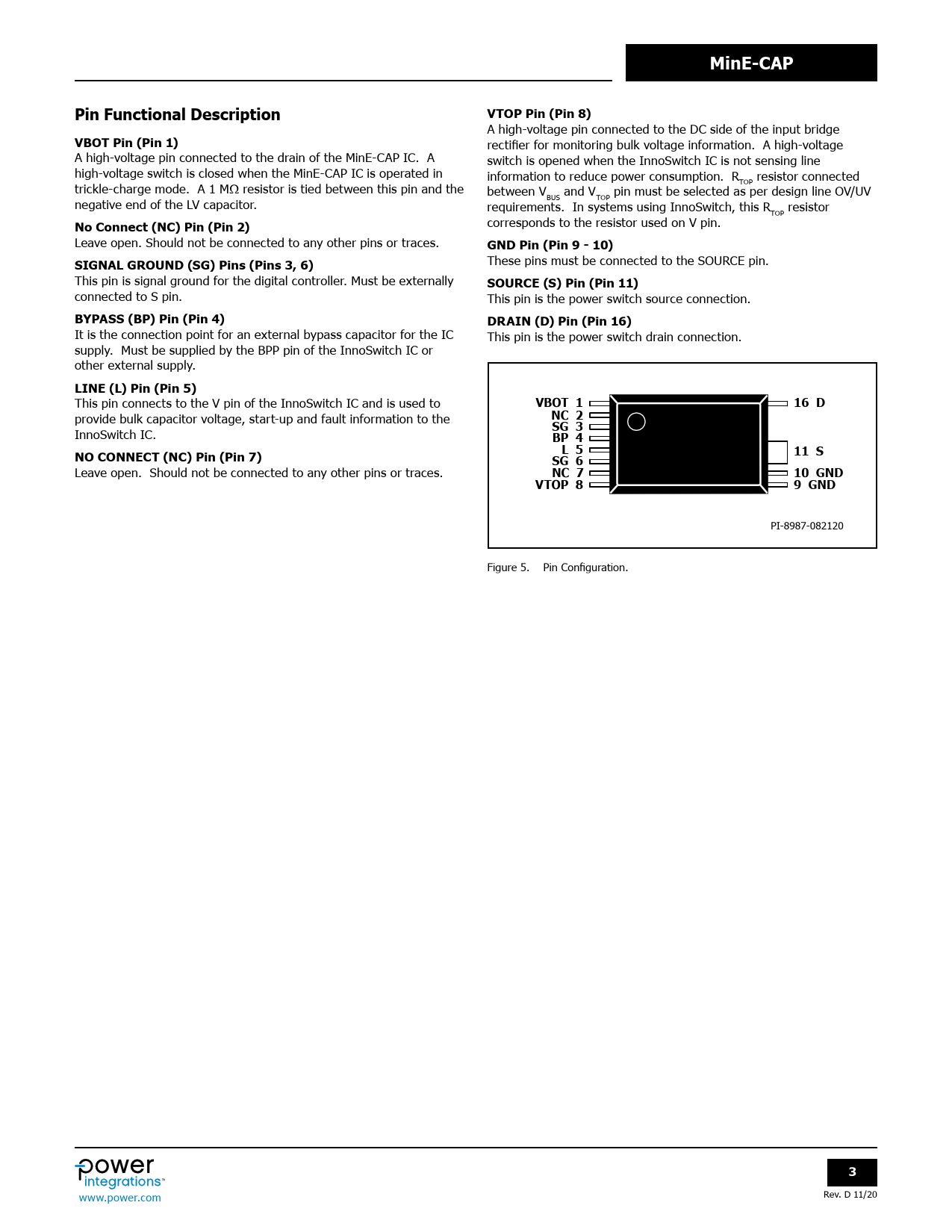 MinE-CAPPin Functional DescriptionVTOP Pin (Pin 8) A high-voltage pin connected to the DC side of the input bridge VBOT Pin (Pin 1) rectifier for monitoring bulk voltage information. A high-voltage A high-voltage pin connected to the drain of the MinE-CAP IC. A switch is opened when the InnoSwitch IC is not sensing line high-voltage switch is closed when the MinE-CAP IC is operated in information to reduce power consumption. R resistor connected trickle-charge mode. A 1 MW resistor is tied between this pin and the TOP between V and V pin must be selected as per design line OV/UV negative end of the LV capacitor. BUS TOP requirements. In systems using InnoSwitch, this R resistor TOP No Connect (NC) Pin (Pin 2) corresponds to the resistor used on V pin. Leave open. Should not be connected to any other pins or traces. GND Pin (Pin 9 - 10)SIGNAL GROUND (SG) Pins (Pins 3, 6) These pins must be connected to the SOURCE pin. This pin is signal ground for the digital control er. Must be external y SOURCE (S) Pin (Pin 11) connected to S pin. This pin is the power switch source connection. BYPASS (BP) Pin (Pin 4)DRAIN (D) Pin (Pin 16) It is the connection point for an external bypass capacitor for the IC This pin is the power switch drain connection. supply. Must be supplied by the BPP pin of the InnoSwitch IC or other external supply. LINE (L) Pin (Pin 5) This pin connects to the V pin of the InnoSwitch IC and is used to VBOT 116 D provide bulk capacitor voltage, start-up and fault information to the NC 2 MIN1072M InnoSwitch IC. SG 3BP 4 YYWW NO CONNECT (NC) Pin (Pin 7)L 511 SSG 6 %%7654321A Leave open. Should not be connected to any other pins or traces. NC 710 GNDVTOP 89 GND PI-8987-082120 Figure 5. Pin Configuration. 3 Rev. D 11/20 www.power.com