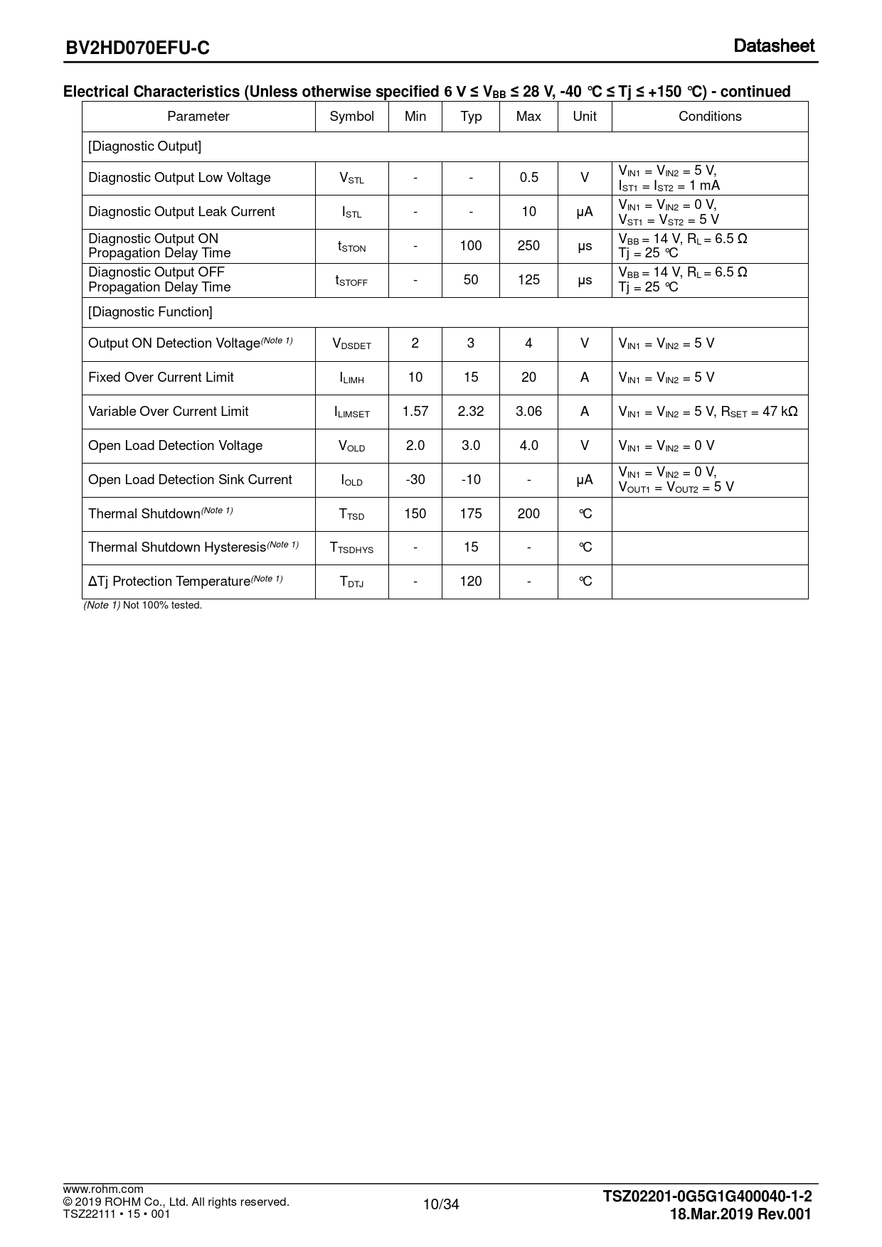 Parameter Symbol Min Typ Max Unit Conditions [Diagnostic Output] V Diagnostic Output Low Voltage V IN1 = VIN2 = 5 V, STL - - 0.5 V IST1 = IST2 = 1 mA V Diagnostic Output Leak Current I IN1 = VIN2 = 0 V, STL - - 10 μA VST1 = VST2 = 5 V Diagnostic Output ON V t BB = 14 V, RL = 6.5 Ω Propagation Delay Time STON - 100 250 μs Tj = 25 °C Diagnostic Output OFF V t BB = 14 V, RL = 6.5 Ω Propagation Delay Time STOFF - 50 125 μs Tj = 25 °C [Diagnostic Function] Output ON Detection Voltage(Note 1) VDSDET 2 3 4 V VIN1 = VIN2 = 5 V Fixed Over Current Limit ILIMH 10 15 20 A VIN1 = VIN2 = 5 V Variable Over Current Limit ILIMSET 1.57 2.32 3.06 A VIN1 = VIN2 = 5 V, RSET = 47 kΩ Open Load Detection Voltage VOLD 2.0 3.0 4.0 V VIN1 = VIN2 = 0 V V Open Load Detection Sink Current I IN1 = VIN2 = 0 V, OLD -30 -10 - μA VOUT1 = VOUT2 = 5 V Thermal Shutdown(Note 1) TTSD 150 175 200 °C Thermal Shutdown Hysteresis(Note 1) TTSDHYS - 15 - °C ΔTj Protection Temperature(Note 1) TDTJ - 120 - °C (Note 1) Not 100% tested. www.rohm.com