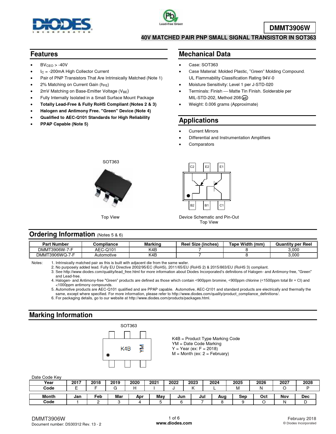 DMMT3906W-7-F AEC-Q101 K4B 7 8 3,000 DMMT3906WQ-7-F Automotive K4B 7 8 3,000 Notes: 1. Intrinsically matched pair as this is built with adjacent die from the same wafer. 2. No purposely added lead. Fully EU Directive 2002/95/EC (RoHS), 2011/65/EU (RoHS 2) & 2015/863/EU (RoHS 3) compliant. 3. See http://www.diodes.com/quality/lead_free.html for more information about Diodes Incorporated’s definitions of Halogen- and Antimony-free, "Green" and Lead-free. 4. Halogen- and Antimony-free "Green” products are defined as those which contain <900ppm bromine, <900ppm chlorine (<1500ppm total Br + Cl) and <1000ppm antimony compounds. 5. Automotive products are AEC-Q101 qualified and are PPAP capable. Automotive, AEC-Q101 and standard products are electrically and thermally the same, except where specified. For more information, please refer to http://www.diodes.com/quality/product_compliance_definitions/. 6. For packaging details, go to our website at http://www.diodes.com/products/packages.html.