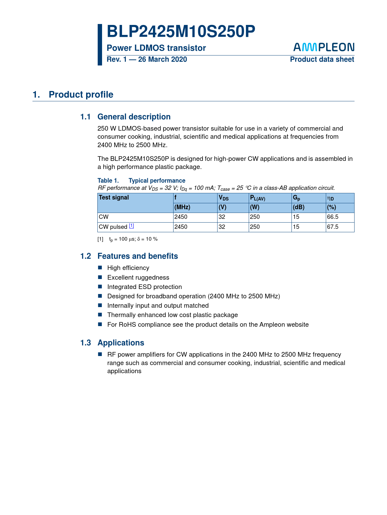 BLP2425M10S250P Power LDMOS transistor. Rev. 1 — 26 March 2020. Product data sheet. 1. Product. profile. 1.1 General description