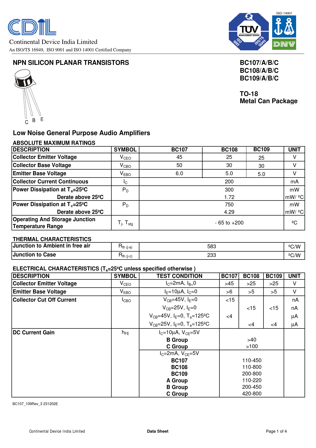 Datasheet BC107/A/B/C, BC108/A/B/C, BC109/A/B/C CDIL