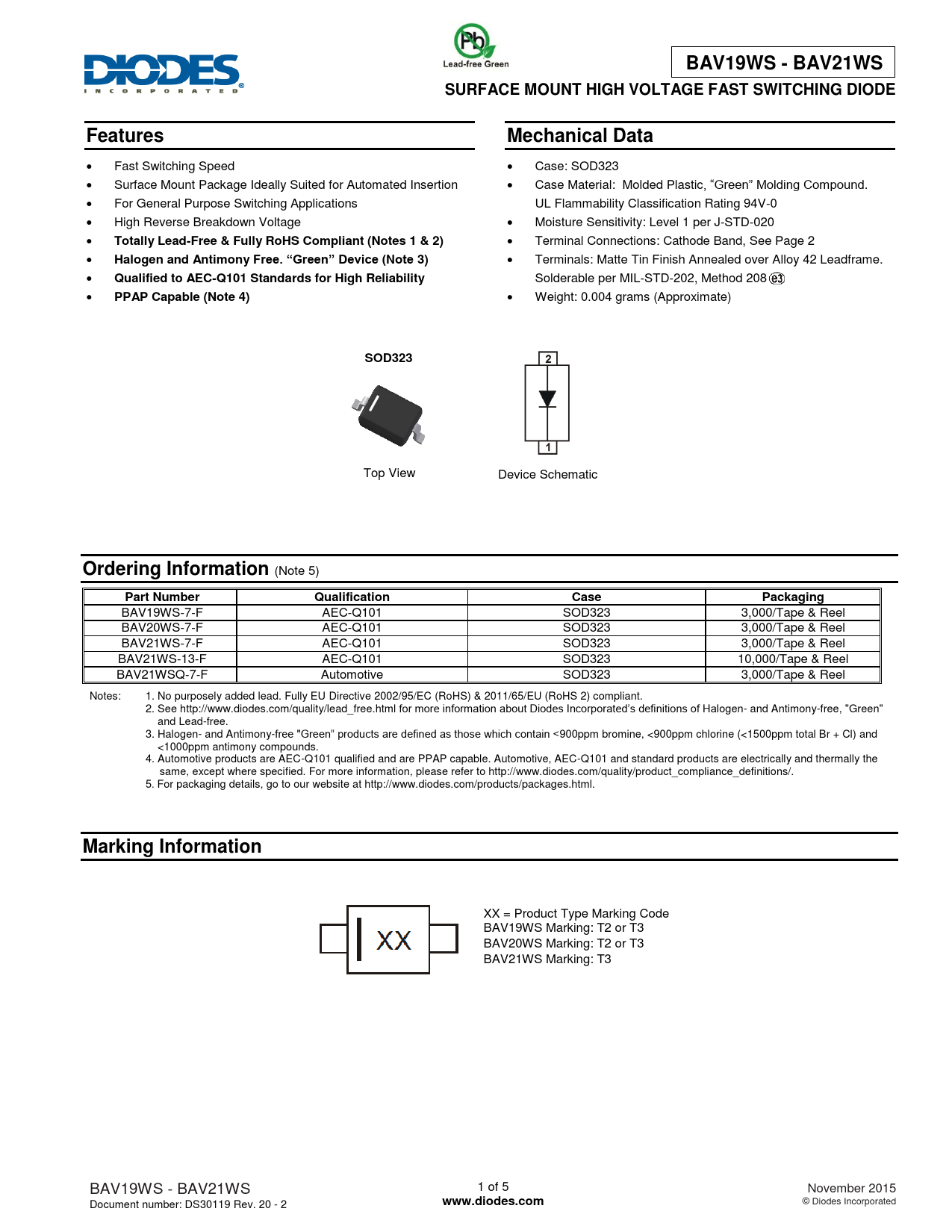 BAV19WS-7-F AEC-Q101 SOD323 3,000/Tape & Reel BAV20WS-7-F AEC-Q101 SOD323 3,000/Tape & Reel BAV21WS-7-F AEC-Q101 SOD323 3,000/Tape & Reel BAV21WS-13-F AEC-Q101 SOD323 10,000/Tape & Reel BAV21WSQ-7-F Automotive SOD323 3,000/Tape & Reel Notes: 1. No purposely added lead. Fully EU Directive 2002/95/EC (RoHS) & 2011/65/EU (RoHS 2) compliant. 2. See http://www.diodes.com/quality/lead_free.html for more information about Diodes Incorporated’s definitions of Halogen- and Antimony-free, "Green" and Lead-free. 3. Halogen- and Antimony-free "Green” products are defined as those which contain <900ppm bromine, <900ppm chlorine (<1500ppm total Br + Cl) and <1000ppm antimony compounds. 4. Automotive products are AEC-Q101 qualified and are PPAP capable. Automotive, AEC-Q101 and standard products are electrically and thermally the same, except where specified. For more information, please refer to http://www.diodes.com/quality/product_compliance_definitions/. 5. For packaging details, go to our website at http://www.diodes.com/products/packages.html.