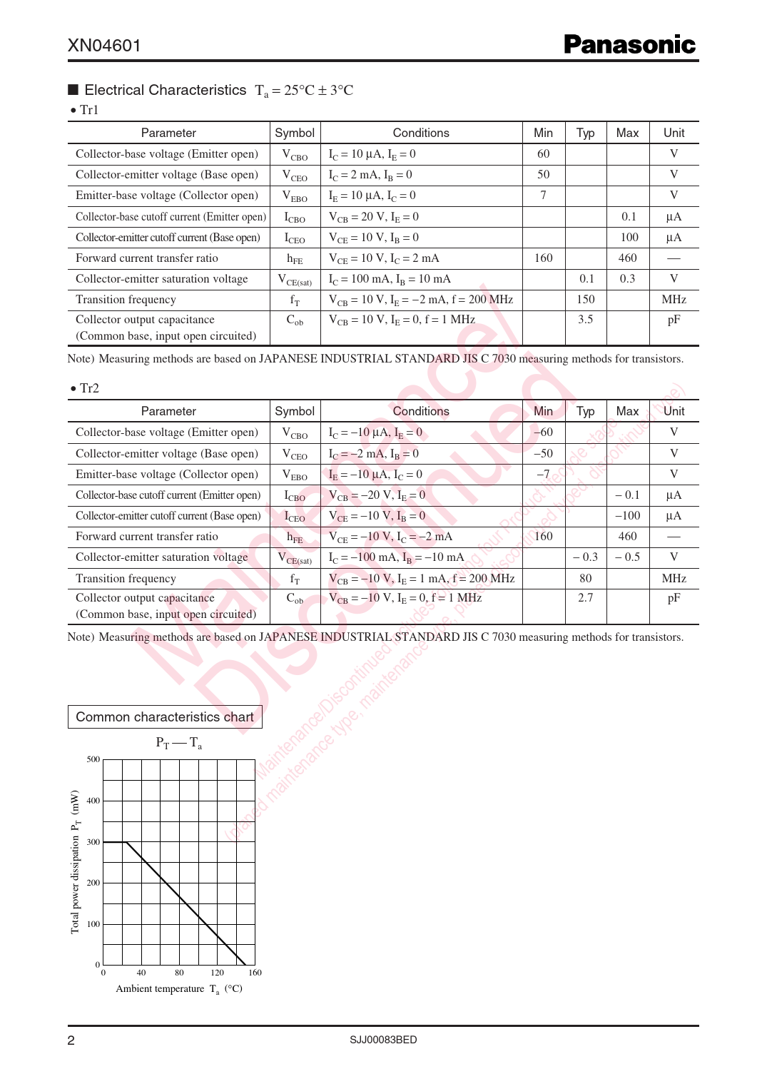 XN04601 ■ Electrical Characteristics Ta = 25°C ± 3°C • Tr1 Parameter Symbol Conditions Min Typ Max Unit Collector-base voltage (Emitter open) V CBO IC = 10 µA, IE = 0 60 V Collector-emitter voltage (Base open) VCEO IC = 2 mA, IB = 0 50 V Emitter-base voltage (Collector open) V EBO IE = 10 µA, IC = 0 7 V Collector-base cutoff current (Emitter open) ICBO VCB = 20 V, IE = 0 0.1 µA Collector-emitter cutoff current (Base open) ICEO VCE = 10 V, IB = 0 100 µA Forward current transfer ratio hFE VCE = 10 V, IC = 2 mA 160 460  Collector-emitter saturation voltage VCE(sat) IC = 100 mA, IB = 10 mA 0.1 0.3 V Transition frequency fT VCB = 10 V, IE = −2 mA, f = 200 MHz 150 MHz Collector output capacitance Cob VCB = 10 V, IE = 0, f = 1 MHz 3.5 pF (Common base, input open circuited) Note) Measuring methods are based on JAPANESE INDUSTRIAL STANDARD JIS C 7030 measuring methods for transistors. • Tr2 Parameter Symbol Conditions Min Typ Max Unit Collector-base voltage (Emitter open) VCBO IC = −10 µA, IE = 0 −60 V Collector-emitter voltage (Base open) VCEO IC = −2 mA, IB = 0 −50 V Emitter-base voltage (Collector open) VEBO IE = −10 µA, IC = 0 −7 V Collector-base cutoff current (Emitter open) ICBO VCB = −20 V, IE = 0 − 0.1 µA Collector-emitter cutoff current (Base open) ICEO VCE = −10 V, IB = 0 −100 µA Forward current transfer ratio hFE VCE = −10 V, IC = −2 mA 160 460  Collector-emitter saturation voltage VCE(sat) IC = −100 mA, IB = −10 mA − 0.3 − 0.5 V Transition frequency fT VCB = −10 V, IE = 1 mA, f = 200 MHz 80 MHz Collector output capacitance Cob VCB = −10 V, IE = 0, f = 1 MHz 2.7 pF (Common base, input open circuited) Note) Measuring methods are based on JAPANESE INDUSTRIAL STANDARD JIS C 7030 measuring methods for transistors. Maintenance/ Discontinued Common characteristics chart PT  Ta 500 Maintenance/Discontinued includes following four Product lifecycle stage. ) 400 (mW T P (planed maintenance type, maintenance type, planed discontinued typed, discontinued type) 300 200 100 Total power dissipation 0 0 40 80 120 160 Ambient temperature T (°C) a 2 SJJ00083BED