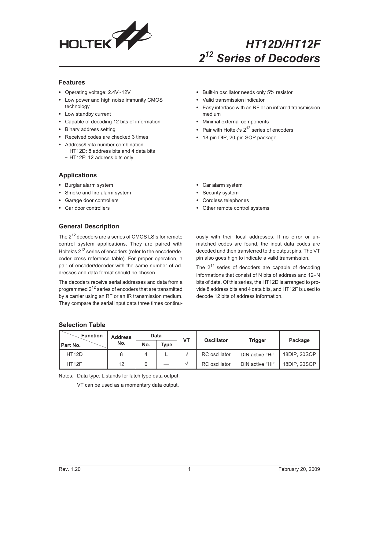 页数 / 页12 / 1 — HT12D/HT12F. 212 Series of Decoders. Features. Applications. General …