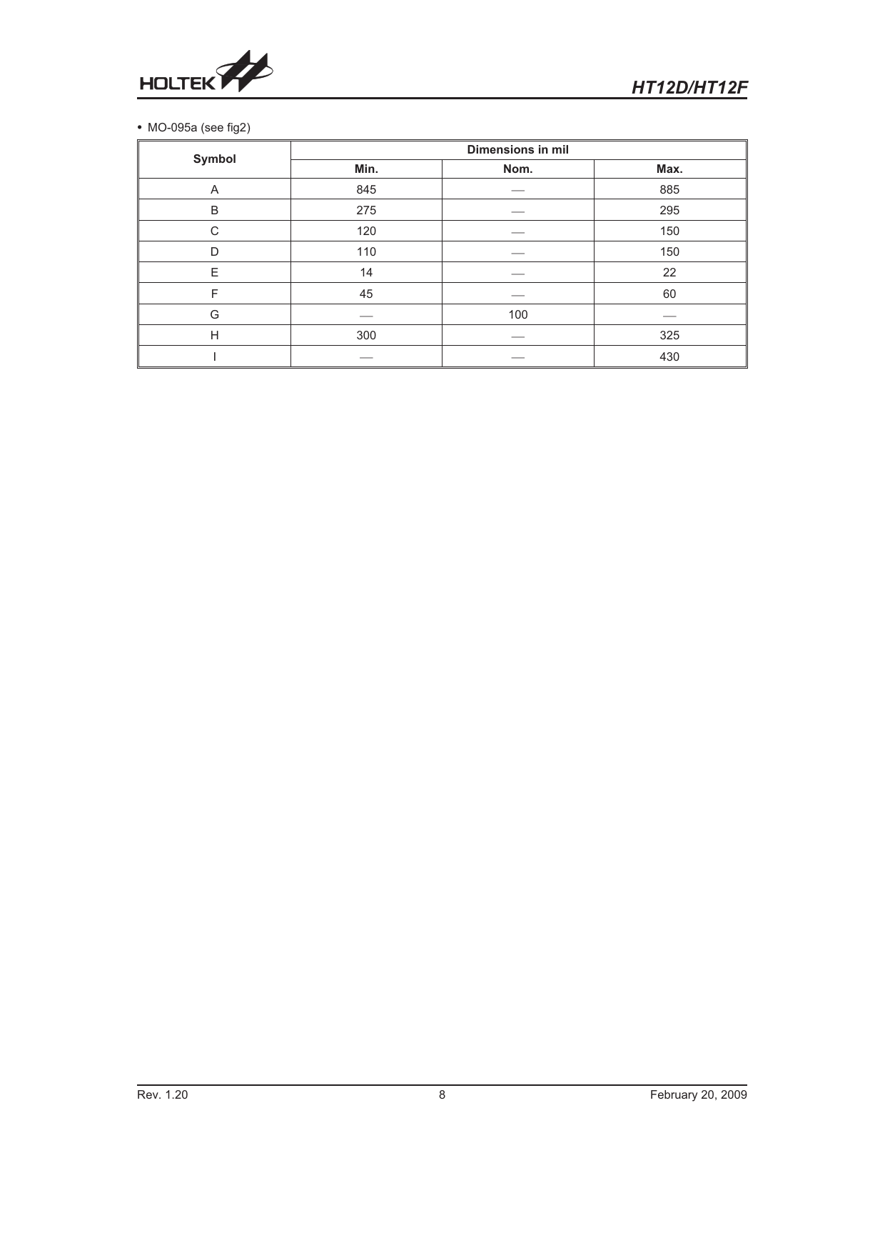 页数 / 页12 / 8 — HT12D/HT12F. Dimensions in mil. Symbol. Min. Nom. Max