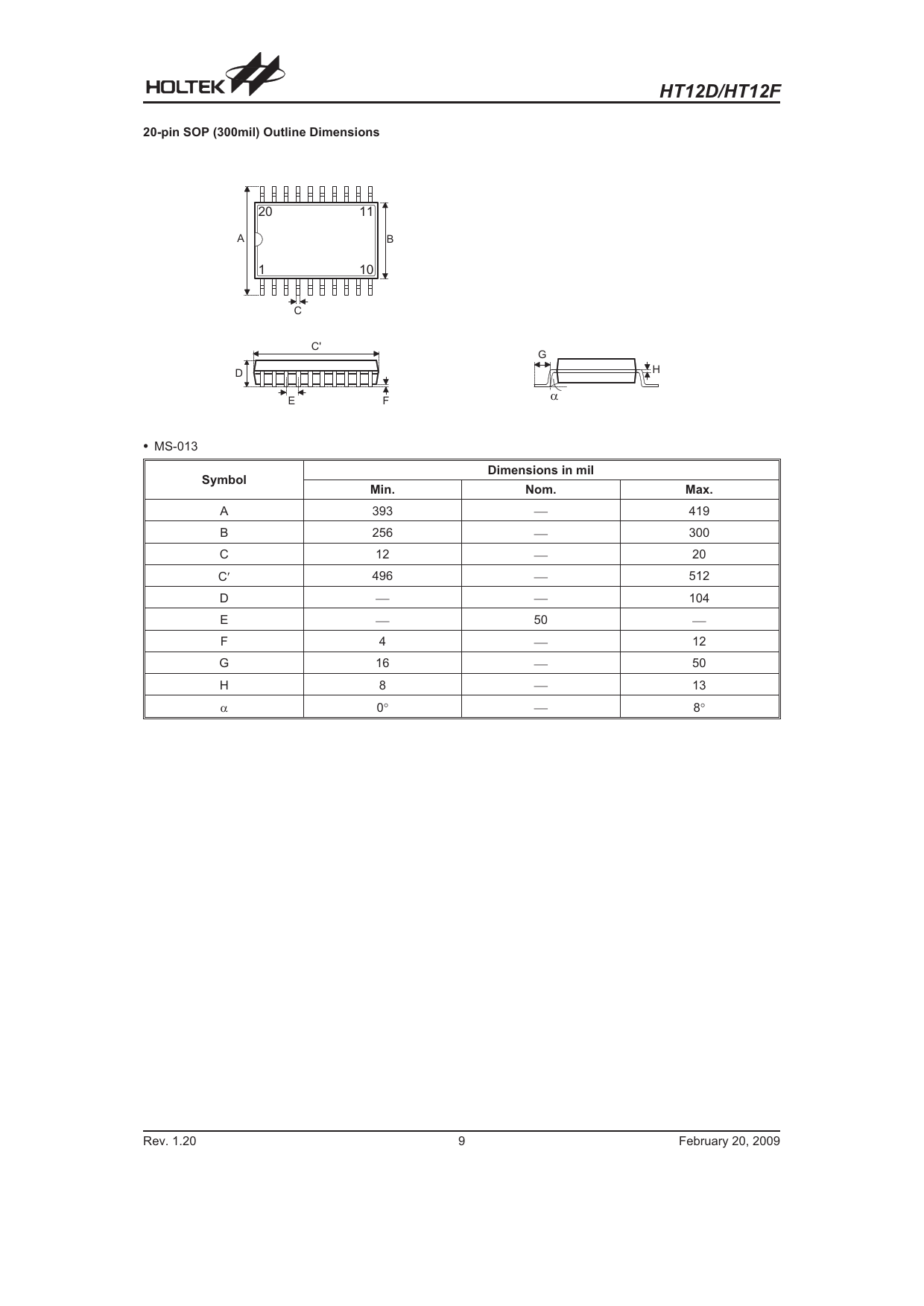 页数 / 页12 / 9 — HT12D/HT12F. 20-pin SOP (300mil) Outline Dimensions. Dimensions in mil. …