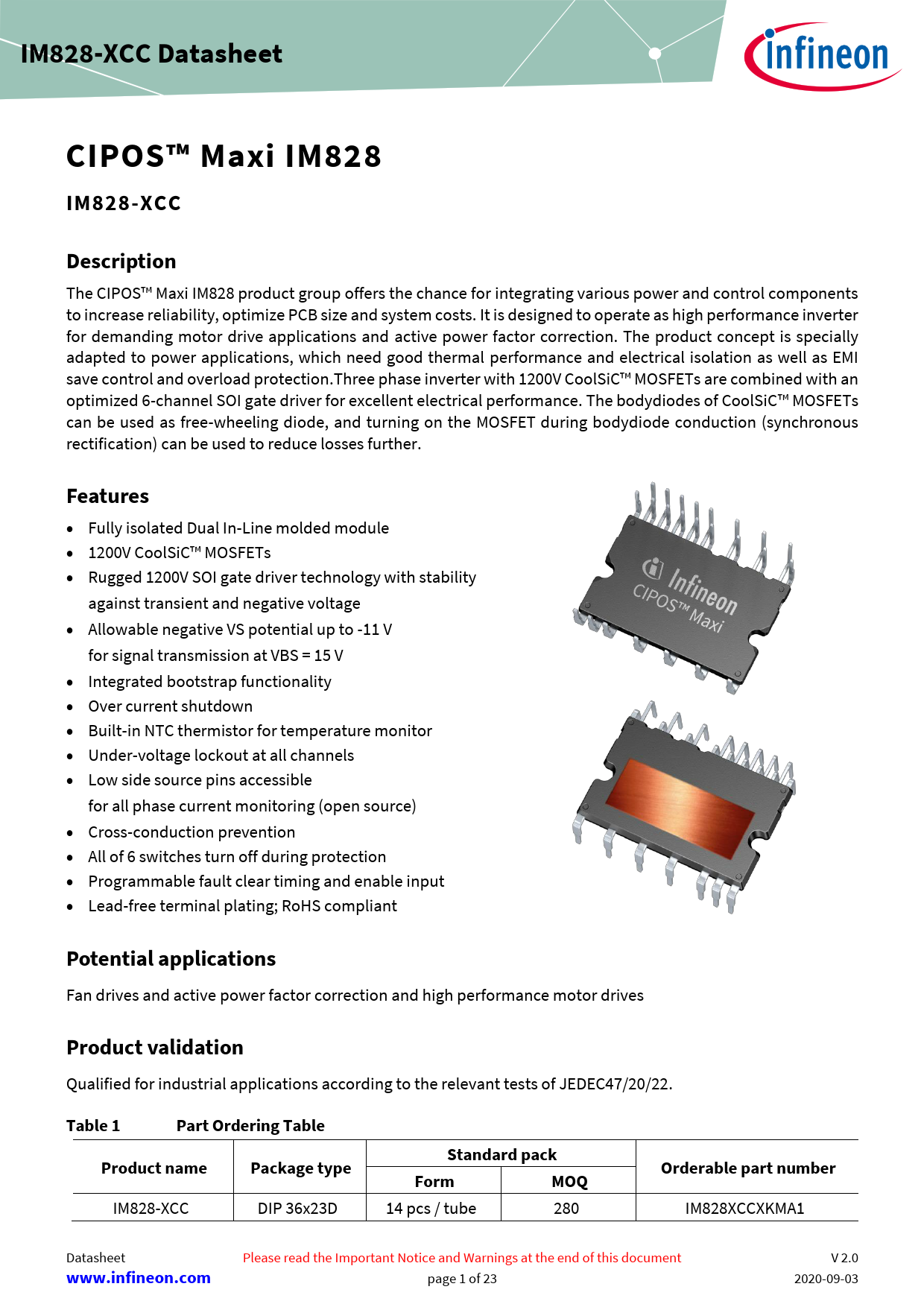 IM828-XCC Datasheet. CIPOS™ Maxi IM828 IM828-XCC. Description. Features. Potential applications. Product validation. Table 1