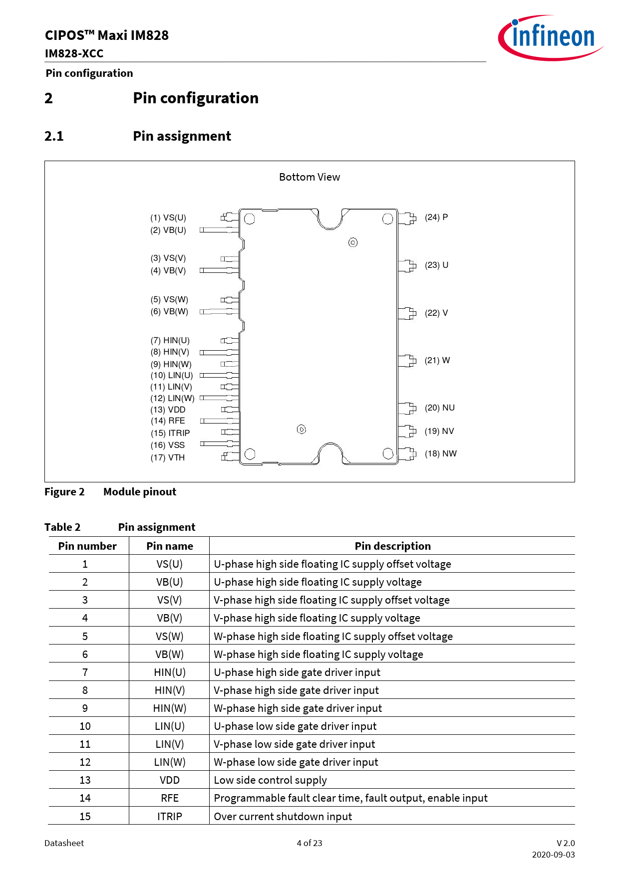 CIPOS™ Maxi IM828IM828-XCCPin configuration2Pin configuration2.1Pin assignment Bottom View (1) VS(U) (24) P (2) VB(U) (3) VS(V) (23) U (4) VB(V) (5) VS(W) (6) VB(W) (22) V (7) HIN(U) (8) HIN(V) (9) HIN(W) (21) W (10) LIN(U) (11) LIN(V) (12) LIN(W) (13) VDD (20) NU (14) RFE (15) ITRIP (19) NV (16) VSS (18) NW (17) VTH Figure 2Module pinoutTable 2Pin assignmentPin numberPin namePin description 1 VS(U) U-phase high side floating IC supply offset voltage 2 VB(U) U-phase high side floating IC supply voltage 3 VS(V) V-phase high side floating IC supply offset voltage 4 VB(V) V-phase high side floating IC supply voltage 5 VS(W) W-phase high side floating IC supply offset voltage 6 VB(W) W-phase high side floating IC supply voltage 7 HIN(U) U-phase high side gate driver input 8 HIN(V) V-phase high side gate driver input 9 HIN(W) W-phase high side gate driver input 10 LIN(U) U-phase low side gate driver input 11 LIN(V) V-phase low side gate driver input 12 LIN(W) W-phase low side gate driver input 13 VDD Low side control supply 14 RFE Programmable fault clear time, fault output, enable input 15 ITRIP Over current shutdown input Datasheet 4 of 23 V 2.0 2020-09-03