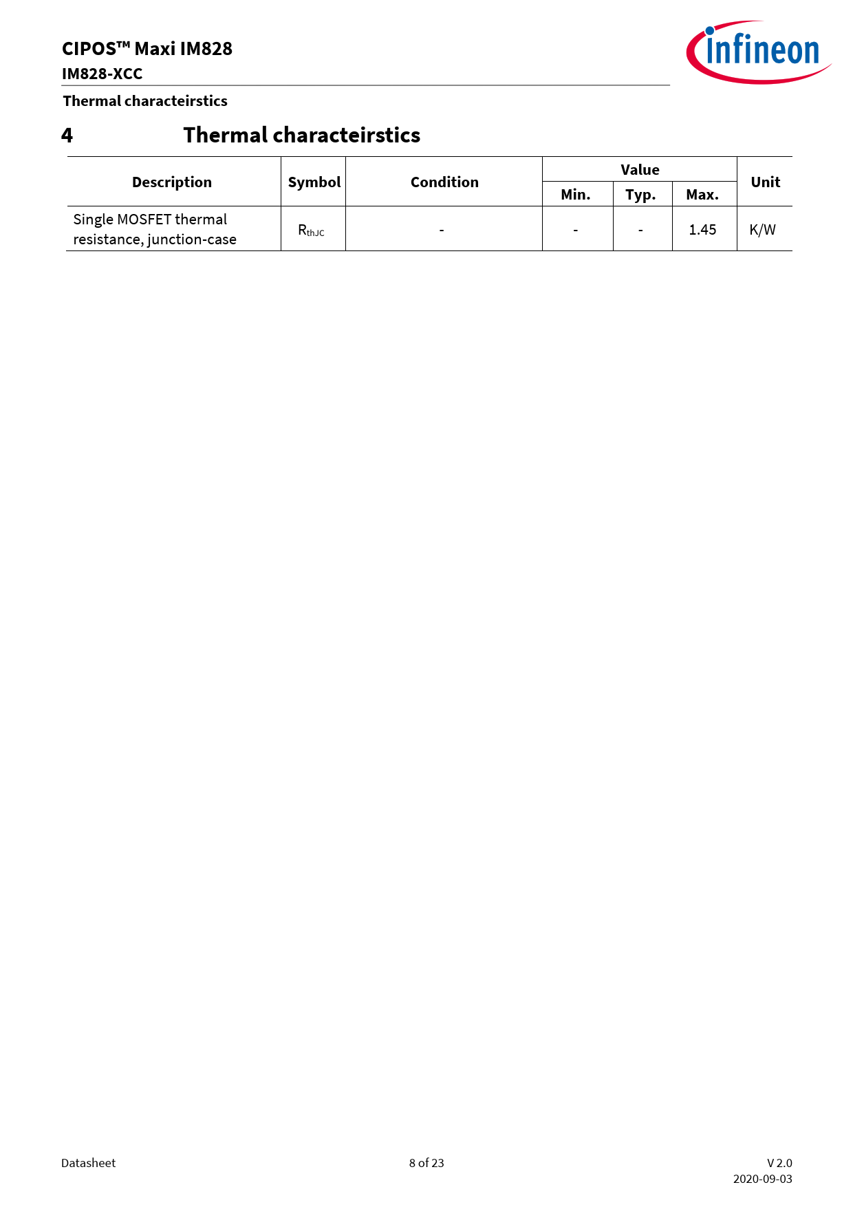 Single MOSFET thermal R resistance, junction-case thJC - - - 1.45 K/W Datasheet 8 of 23 V 2.0 2020-09-03