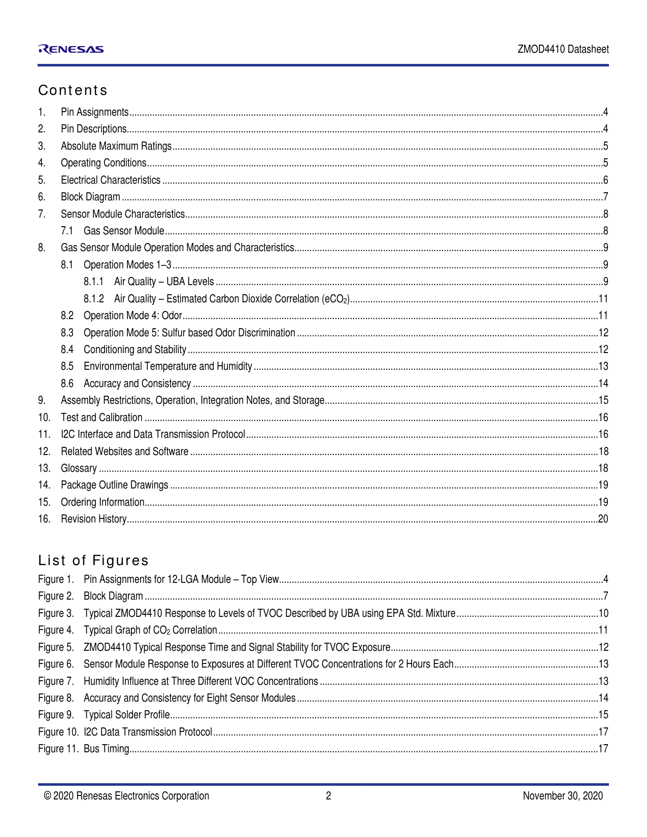 1. Pin Assignments ...4 2. Pin Descriptions ..4 3. Absolute Maximum Ratings ..5 4. Operating Conditions ..5 5. Electrical Characteristics ..6 6. Block Diagram ..7 7. Sensor Module Characteristics ...8 7.1 Gas Sensor Module ...8 8. Gas Sensor Module Operation Modes and Characteristics ..9 8.1 Operation Modes 1–3 ..9 8.1.1 Air Quality – UBA Levels ...9 8.1.2 Air Quality – Estimated Carbon Dioxide Correlation (eCO2) ..11 8.2 Operation Mode 4: Odor ..11 8.3 Operation Mode 5: Sulfur based Odor Discrimination ...12 8.4 Conditioning and Stability ..12 8.5 Environmental Temperature and Humidity ..13 8.6 Accuracy and Consistency ..14 9. Assembly Restrictions, Operation, Integration Notes, and Storage ..15 10. Test and Calibration ...16 11. I2C Interface and Data Transmission Protocol ...16 12. Related Websites and Software ...18 13. Glossary ...18 14. Package Outline Drawings ...19 15. Ordering Information ...19 16. Revision History ..20