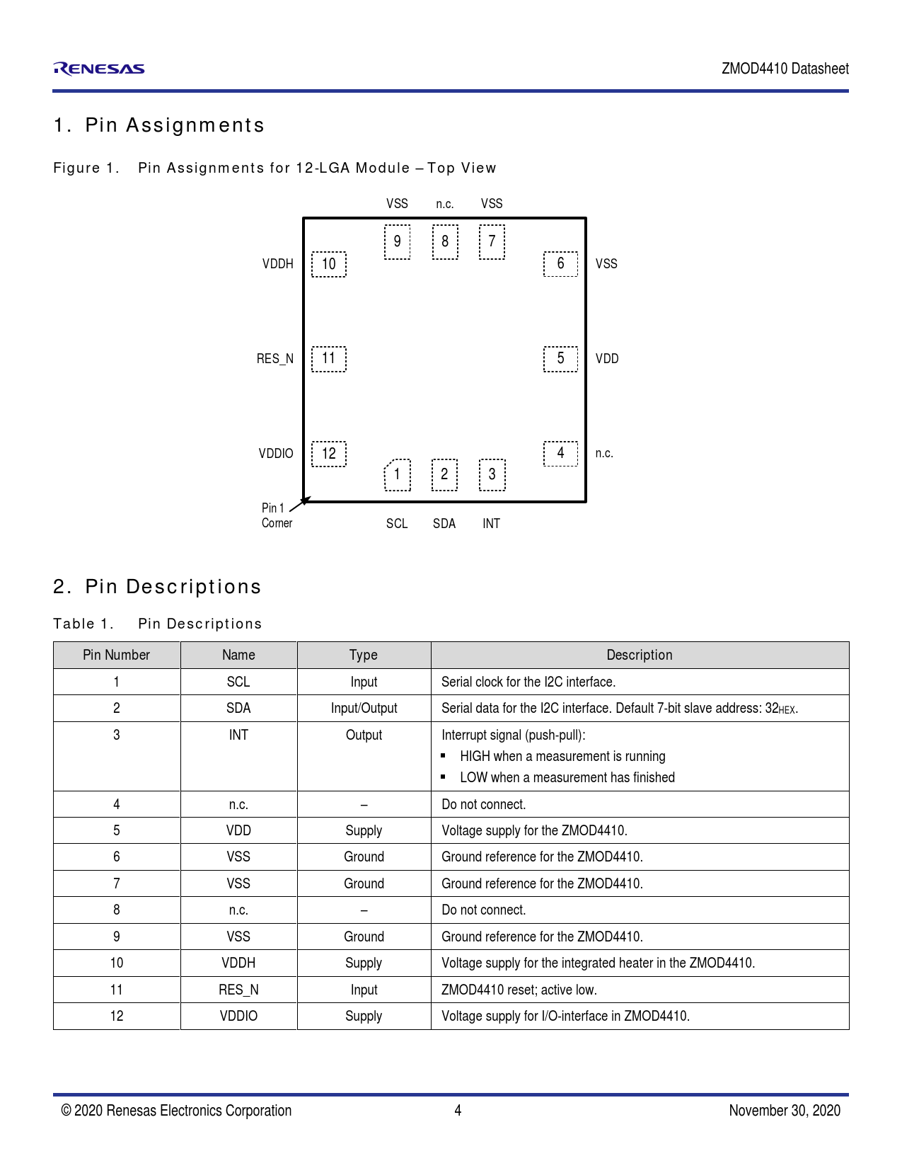 1 SCL Input Serial clock for the I2C interface. 2 SDA Input/Output Serial data for the I2C interface. Default 7-bit slave address: 32HEX. 3 INT Output Interrupt signal (push-pull): HIGH when a measurement is running LOW when a measurement has finished 4 n.c. – Do not connect. 5 VDD Supply Voltage supply for the ZMOD4410. 6 VSS Ground Ground reference for the ZMOD4410. 7 VSS Ground Ground reference for the ZMOD4410. 8 n.c. – Do not connect. 9 VSS Ground Ground reference for the ZMOD4410. 10 VDDH Supply Voltage supply for the integrated heater in the ZMOD4410. 11 RES_N Input ZMOD4410 reset; active low. 12 VDDIO Supply Voltage supply for I/O-interface in ZMOD4410. © 2020 Renesas Electronics Corporation 4 November 30, 2020 Document Outline 1. Pin Assignments 2. Pin Descriptions 3. Absolute Maximum Ratings 4. Operating Conditions 5. Electrical Characteristics 6. Block Diagram 7. Sensor Module Characteristics 7.1 Gas Sensor Module 8. Gas Sensor Module Operation Modes and Characteristics 8.1 Operation Modes 1–3 8.1.1 Air Quality – UBA Levels 8.1.2 Air Quality – Estimated Carbon Dioxide Correlation (eCO2) 8.2 Operation Mode 4: Odor 8.3 Operation Mode 5: Sulfur based Odor Discrimination 8.4 Conditioning and Stability 8.5 Environmental Temperature and Humidity 8.6 Accuracy and Consistency 9. Assembly Restrictions, Operation, Integration Notes, and Storage 10. Test and Calibration 11. I2C Interface and Data Transmission Protocol 12. Related Websites and Software 13. Glossary 14. Package Outline Drawings 15. Ordering Information 16. Revision History
