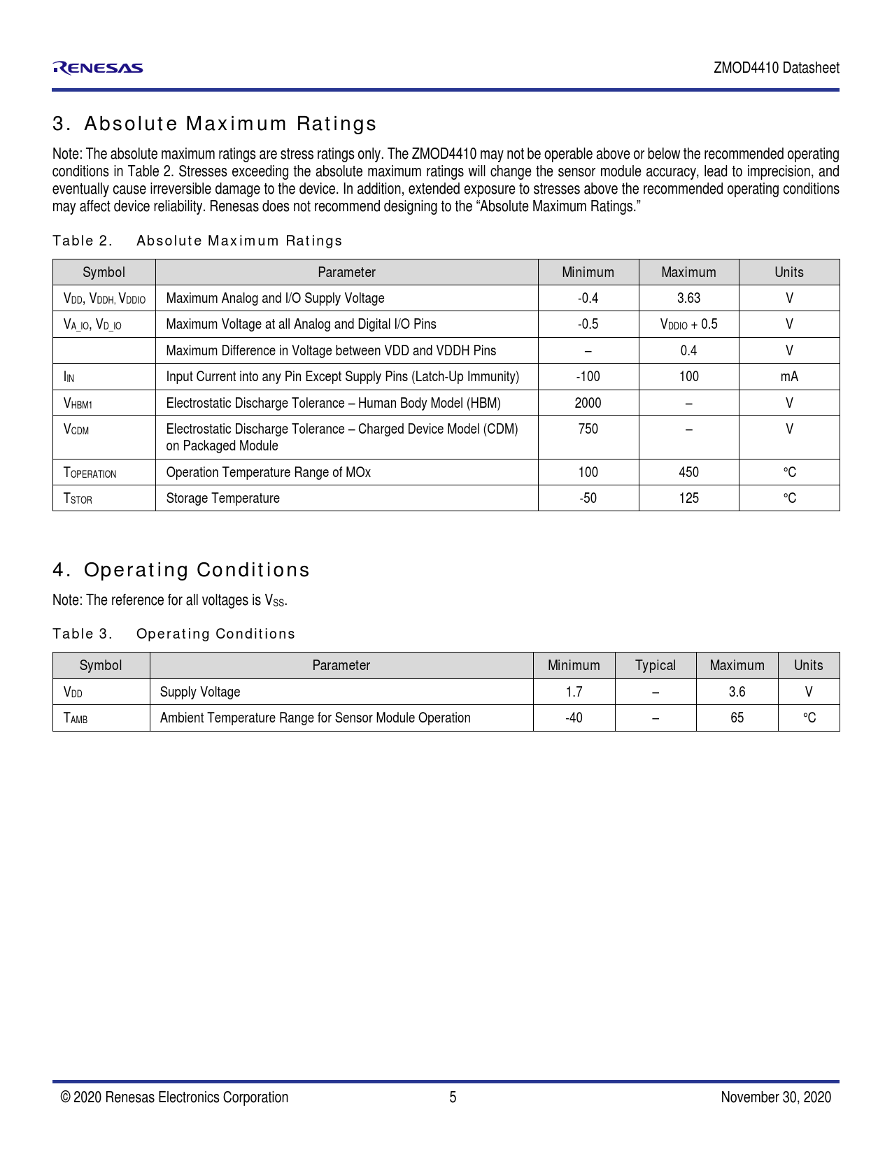 Note: The absolute maximum ratings are stress ratings only. The ZMOD4410 may not be operable above or below the recommended operating conditions in Table 2. Stresses exceeding the absolute maximum ratings wil change the sensor module accuracy, lead to imprecision, and eventual y cause irreversible damage to the device. In addition, extended exposure to stresses above the recommended operating conditions may affect device reliability. Renesas does not recommend designing to the “Absolute Maximum Ratings.”