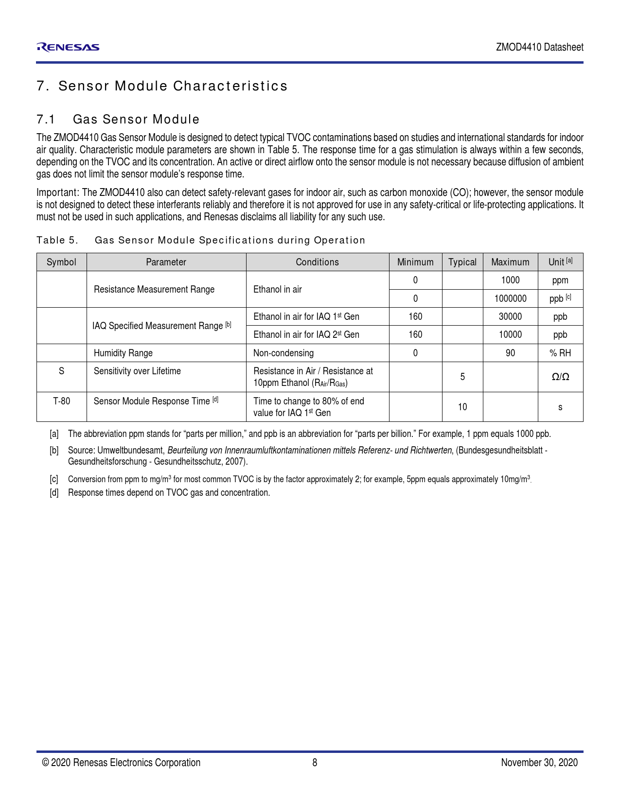 0 1000 ppm Resistance Measurement Range Ethanol in air 0 1000000 ppb [c] Ethanol in air for IAQ 1st Gen 160 30000 ppb IAQ Specified Measurement Range [b] Ethanol in air for IAQ 2st Gen 160 10000 ppb Humidity Range Non-condensing 0 90 % RH S Sensitivity over Lifetime Resistance in Air / Resistance at 10ppm Ethanol (RAir/RGas) 5 Ω/Ω T-80 Sensor Module Response Time [d] Time to change to 80% of end value for IAQ 1st Gen 10 s [a] The abbreviation ppm stands for “parts per mil ion,” and ppb is an abbreviation for “parts per bil ion.” For example, 1 ppm equals 1000 ppb. [b] Source: Umweltbundesamt, Beurteilung von Innenraumluftkontaminationen mittels Referenz- und Richtwerten, (Bundesgesundheitsblatt - Gesundheitsforschung - Gesundheitsschutz, 2007). [c] Conversion from ppm to mg/m3 for most common TVOC is by the factor approximately 2; for example, 5ppm equals approximately 10mg/m3. [d] Response times depend on TVOC gas and concentration. © 2020 Renesas Electronics Corporation 8 November 30, 2020 Document Outline 1. Pin Assignments 2. Pin Descriptions 3. Absolute Maximum Ratings 4. Operating Conditions 5. Electrical Characteristics 6. Block Diagram 7. Sensor Module Characteristics 7.1 Gas Sensor Module 8. Gas Sensor Module Operation Modes and Characteristics 8.1 Operation Modes 1–3 8.1.1 Air Quality – UBA Levels 8.1.2 Air Quality – Estimated Carbon Dioxide Correlation (eCO2) 8.2 Operation Mode 4: Odor 8.3 Operation Mode 5: Sulfur based Odor Discrimination 8.4 Conditioning and Stability 8.5 Environmental Temperature and Humidity 8.6 Accuracy and Consistency 9. Assembly Restrictions, Operation, Integration Notes, and Storage 10. Test and Calibration 11. I2C Interface and Data Transmission Protocol 12. Related Websites and Software 13. Glossary 14. Package Outline Drawings 15. Ordering Information 16. Revision History