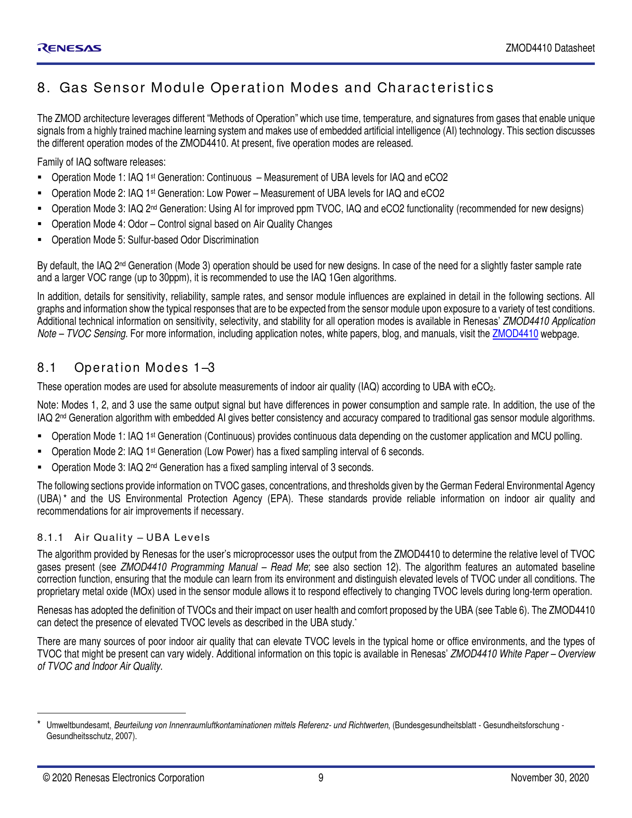The algorithm provided by Renesas for the user’s microprocessor uses the output from the ZMOD4410 to determine the relative level of TVOC gases present (see ZMOD4410 Programming Manual – Read Me; see also section 12). The algorithm features an automated baseline correction function, ensuring that the module can learn from its environment and distinguish elevated levels of TVOC under al conditions. The proprietary metal oxide (MOx) used in the sensor module allows it to respond effectively to changing TVOC levels during long-term operation. Renesas has adopted the definition of TVOCs and their impact on user health and comfort proposed by the UBA (see Table 6). The ZMOD4410 can detect the presence of elevated TVOC levels as described in the UBA study.* There are many sources of poor indoor air quality that can elevate TVOC levels in the typical home or office environments, and the types of TVOC that might be present can vary widely. Additional information on this topic is available in Renesas’ ZMOD4410 White Paper – Overview of TVOC and Indoor Air Quality. * Umweltbundesamt, Beurteilung von Innenraumluftkontaminationen mit els Referenz- und Richtwerten, (Bundesgesundheitsblatt - Gesundheitsforschung - Gesundheitsschutz, 2007). © 2020 Renesas Electronics Corporation 9 November 30, 2020 Document Outline 1. Pin Assignments 2. Pin Descriptions 3. Absolute Maximum Ratings 4. Operating Conditions 5. Electrical Characteristics 6. Block Diagram 7. Sensor Module Characteristics 7.1 Gas Sensor Module 8. Gas Sensor Module Operation Modes and Characteristics 8.1 Operation Modes 1–3 8.1.1 Air Quality – UBA Levels 8.1.2 Air Quality – Estimated Carbon Dioxide Correlation (eCO2) 8.2 Operation Mode 4: Odor 8.3 Operation Mode 5: Sulfur based Odor Discrimination 8.4 Conditioning and Stability 8.5 Environmental Temperature and Humidity 8.6 Accuracy and Consistency 9. Assembly Restrictions, Operation, Integration Notes, and Storage 10. Test and Calibration 11. I2C Interface and Data Transmission Protocol 12. Related Websites and Software 13. Glossary 14. Package Outline Drawings 15. Ordering Information 16. Revision History