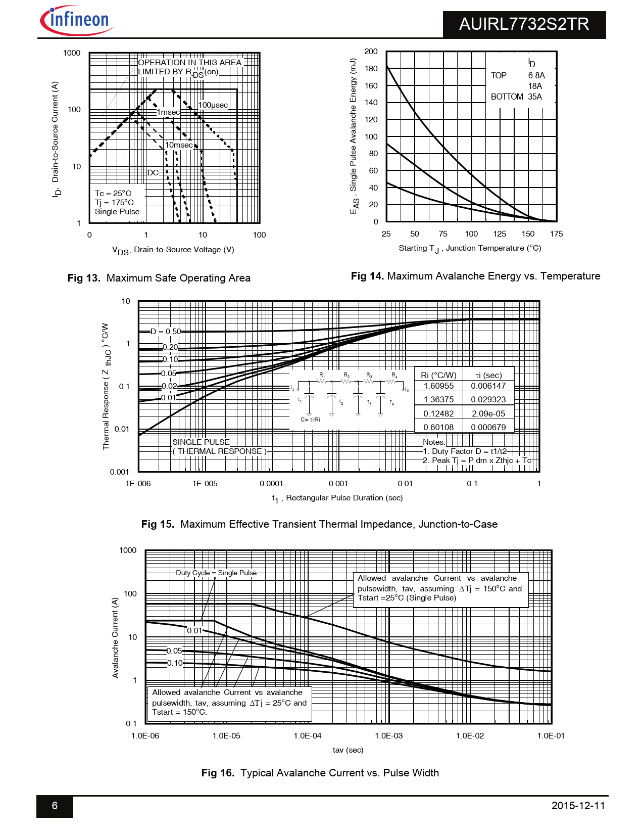AUIRL7732S2TR 1000 200 ) OPERATION IN THIS AREA J ID LIMITED BY R m 180 DS(on) ( TOP 6.8A ) y A g ( r 160 18A t e n n BOTTOM 35A e E r 140 r 100µsec 100 e u 1msec h C c n 120 e a c l r a u v 100 o A S 10msec - e o s t l 80 - u ni 10 P ar DC el 60 D g n , i S 40 I D Tc = 25°C , Tj = 175°C S A 20 Single Pulse E 1 0 0 1 10 100 25 50 75 100 125 150 175 VDS, Drain-to-Source Voltage (V) Starting TJ , Junction Temperature (°C) Fig 13. Maximum Safe Operating Area Fig 14. Maximum Avalanche Energy vs. Temperature 10 W/ D = 0.50 C° ) 1 0.20 CJht 0.10 Z ( 0.05 R R R R 1 2 3 4 Ri (°C/W) i (sec) e R R R R 1 2 3 4 s 0.1 0.02 1.60955 0.006147 n J C o J C p 0.01 1.36375 0.029323 s 1 2 3 4 e 1 2 3 4 R 0.12482 2.09e-05 la Ci= iRi Ci= iRi m 0.01 0.60108 0.000679 reh SINGLE PULSE Notes: T ( THERMAL RESPONSE ) 1. Duty Factor D = t1/t2 2. Peak Tj = P dm x Zthjc + Tc 0.001 1E-006 1E-005 0.0001 0.001 0.01 0.1 1 t1 , Rectangular Pulse Duration (sec) Fig 15. Maximum Effective Transient Thermal Impedance, Junction-to-Case 1000 Duty Cycle = Single Pulse Allowed avalanche Current vs avalanche pulsewidth, tav, assuming Tj = 150°C and 100 ) A Tstart =25°C (Single Pulse) ( tnerruC 0.01 10 ehcn 0.05 ala 0.10 v A 1 Allowed avalanche Current vs avalanche pulsewidth, tav, assuming j = 25°C and Tstart = 150°C. 0.1 1.0E-06 1.0E-05 1.0E-04 1.0E-03 1.0E-02 1.0E-01 tav (sec) Fig 16. Typical Avalanche Current vs. Pulse Width 6 2015-12-11